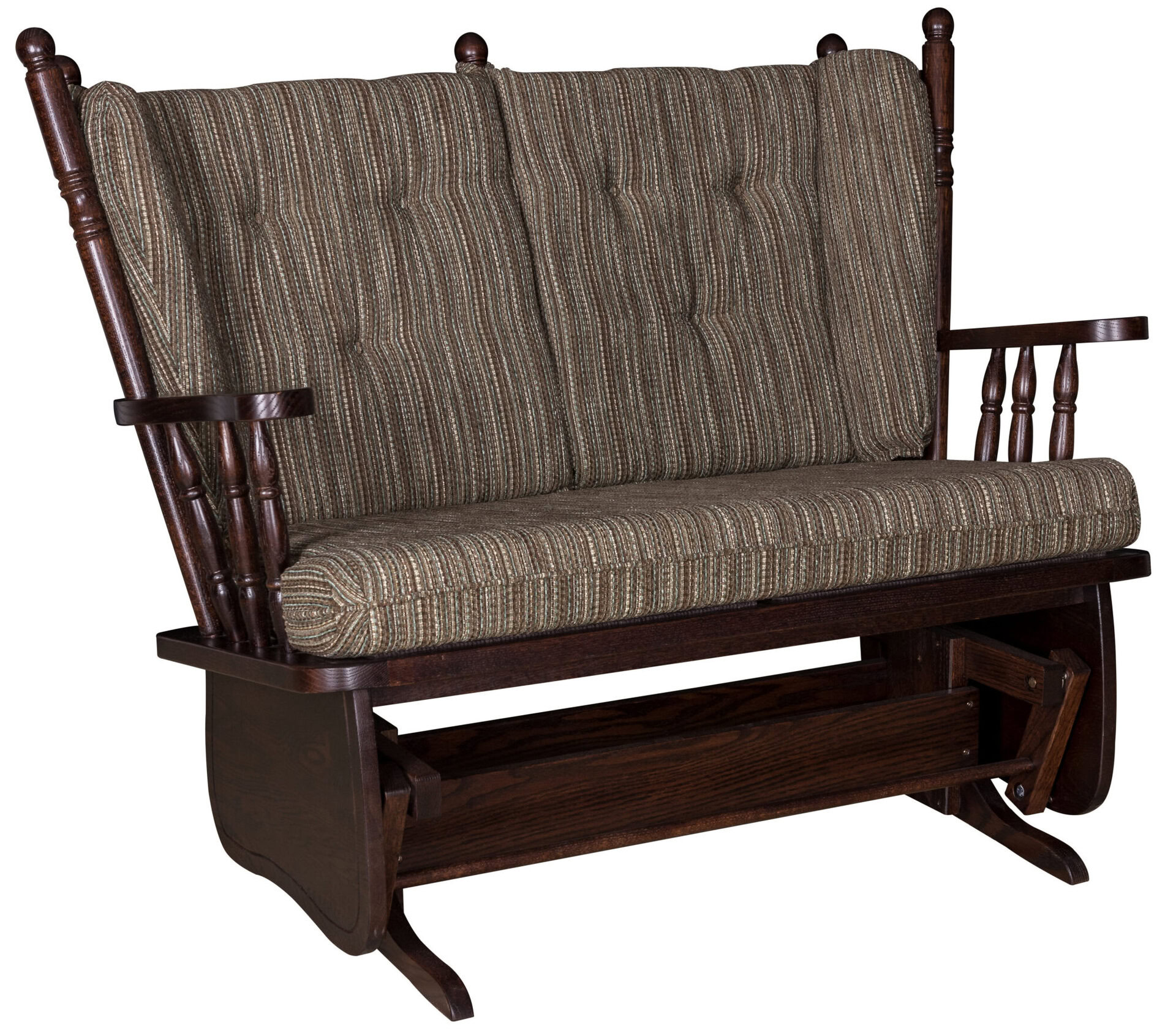Enjoy superb gliding comfort in the great-looking 4 Post Low Back Loveseat Glider – with its smooth glide mechanism. Settle into the plush seating, thanks to the 4-inch foam seat cushion. What’s more, the four turned posts in the backrest create a nook on each side that enhances comfort. Available flip-out footrests provide added comfort. Amish cabinetmakers – the best in the Midwest — build the glider. And they use top hardwoods like oak, maple and cherry. No wonder the piece is so sturdy and heirloom-quality! Ready to order? Click the “Customize this product” button below. Then, fill out the open (blank) fields. Or call 877-357-2106 today.