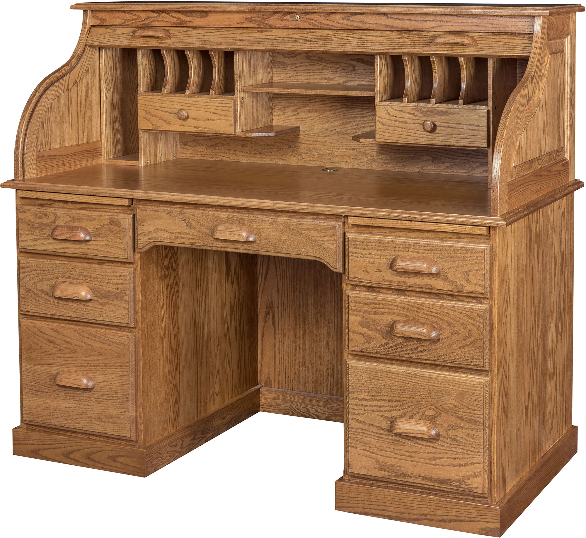 The 56 Inch Hickory Roll Top Desk combines a desk, credenza — and nostalgia. Roll up the tambour (flexible wood panel). And you get a large work area. The two pull-out writing boards expand your work area. While the cubbies and small drawers come in handy for envelopes and miscellaneous office items. The drawers open full-extension for easy access to your files and office supplies. Also, the dovetail drawer joints excel in strength. With the tambour rolled down –- and locked -– your desktop and credenza items are secure. Amish cabinetmakers — the best in the Midwest — build the desk. And they use top hardwoods like oak, maple and hickory (shown with a natural finish). No wonder the piece is so durable and heirloom-quality! Ready to order? Click the “Customize this product” button below. Then, fill out the customizing fields. Or call 877-357-2106.