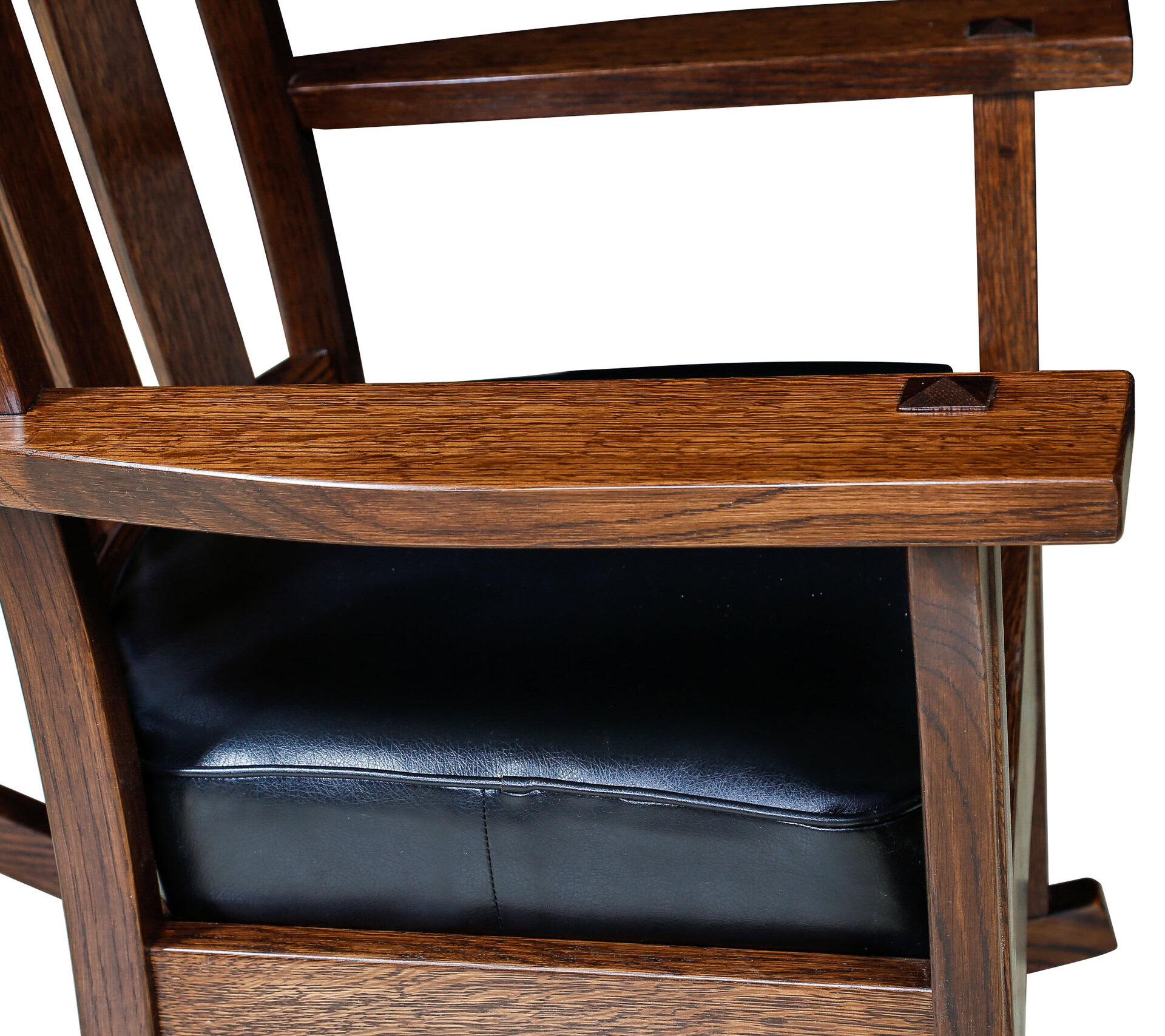Recapture the charm of yesteryear while you relax in comfort with the Artisan Mission Rocking Chair. You’ll love settling into the plush seat with its wide slats. Equally impressive are the Mission features. Check out the slats and decorative corbels. Also, the wooden dowels and exposed tenons on the arms catch the eye. We offer a leather or fabric seat (shown). Amish cabinetmakers – the best in the Midwest – build the rocker. And they use top hardwoods like oak, cherry and maple. No wonder the unit is so great-looking, sturdy and heirloom-quality! Ready to order? Click the “Customize this product” button below. Then, fill out the customization fields. Or call 877-357-2106.