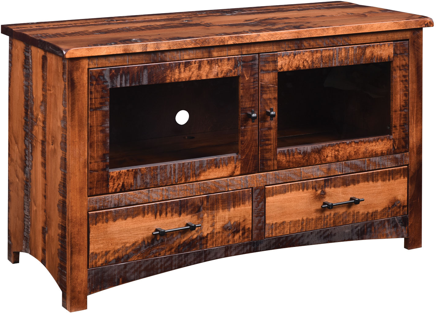 With its rustic features, great storage space and Amish cabinetry, the Barn Floor TV Stand is perfect if you’re looking for a top-quality, midsize TV cabinet. Behind the two glass doors, you’ll find lots of space for your entertainment equipment. While the two drawers provide ample room for your music and movie collections. Amish cabinetmakers — the best in the Midwest — build the cabinet from rustic brown maple. Notice the visible saw marks, plus the Michael’s Cherry stain finish which highlights the wood’s rustic features. What’s more, the piece is so sturdy, it’s heirloom-quality! Ready to order? Click the “Customize this product” button below. Then, fill out the customization fields. Or call 877-357-2106.
