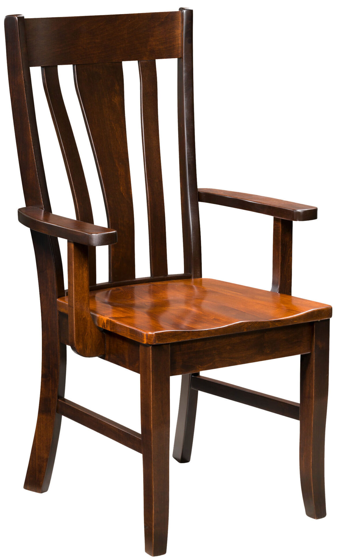 With its elegant slat design, gracious curves and two-tone finish, the Batavia Dining Chair attracts attention. Making it ideal for your upscale dining room. The curved slats provide great back support. While the saddle scoop seat with Mission edge enhances comfort. For even more comfort, ask for an upholstered seat, finished in fabric or leather. Also, you can order your chairs in any combination of side chairs and armchairs. Amish cabinetmakers — the best in the Midwest — build the chair. And, they use top hardwoods like oak, cherry and brown maple (shown with a natural finish on the seat and Onyx Stain elsewhere). So, it’s no surprise that the chair is sturdy and heirloom-quality! Ready to order? Click the “Customize this product” button below. Then, fill out the customization fields. Or call 877-357-2106.