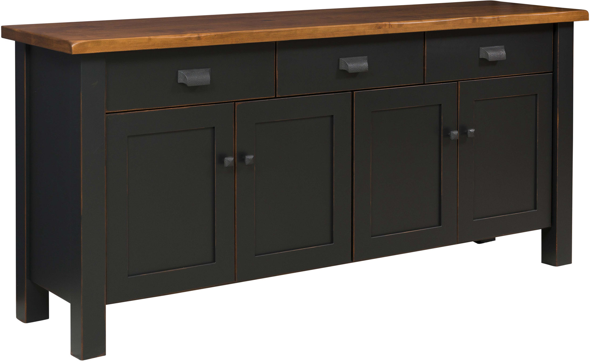 Do you like rustic dining room furniture? Then, you’ll love the Beaumont Buffet. To achieve the rustic look, we build the top from rustic cherry. Also, we give the cabinet a black hue and apply Mike’s rub-through. The drawers open full extension for full access. Plus, they close with a gentle push. Other notable features are rustic hardware. Hidden European hinges. Plus adjustable shelves in the base. Amish cabinetmakers painstakingly handcraft each Beaumont Buffet. Also, the craftsmen use top hardwoods. No wonder the piece is so sturdy. Durable. Beautiful. Also heirloom-quality! Order as shown. Unfinished. Or customized. To order, click the “Customize this product” button below. Then, complete the “Customize Product” fields. Also click the “Get your customized quote” button.