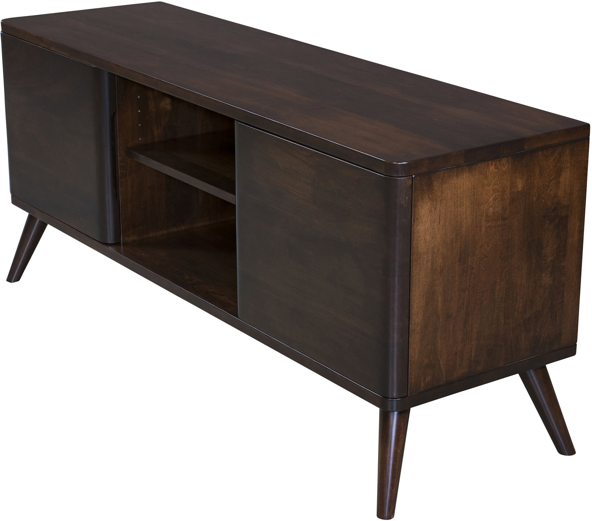 The Bentley TV Stand has a mid-century modern look to it with its splayed legs and clean lines. It comes standard with a 1-inch solid wood top and bottom as well as two 1 1/2-inch thick soft-close doors. Additionally, the doors have indented finger pulls which add to its clean lines and makes opening and closing them a breeze. You will love the closed storage space with adjustable shelf inside, too. It’s the perfect place to store smaller items in your family room that you want to keep out of sight such as DVD’s, blankets, small games, etc.