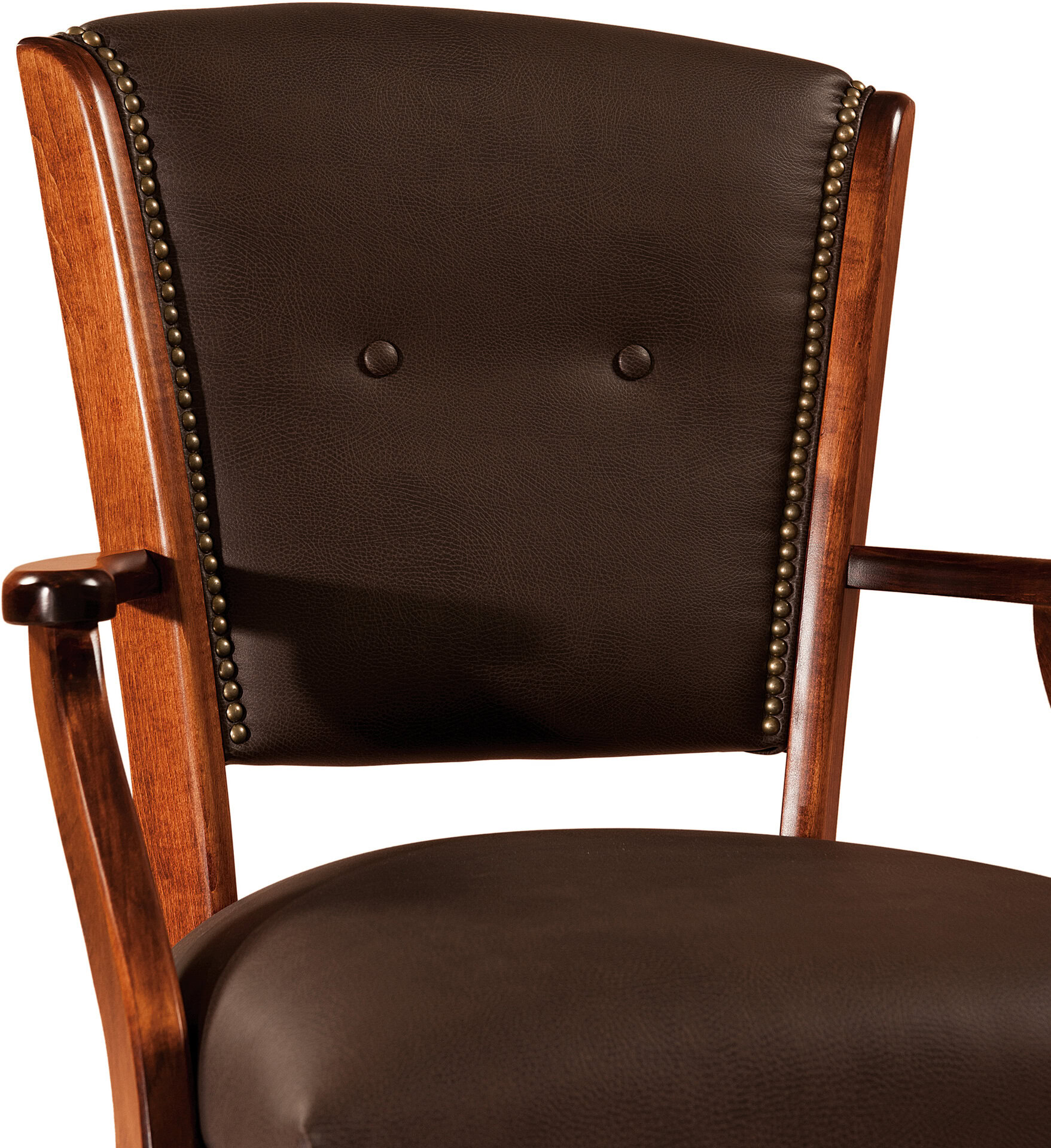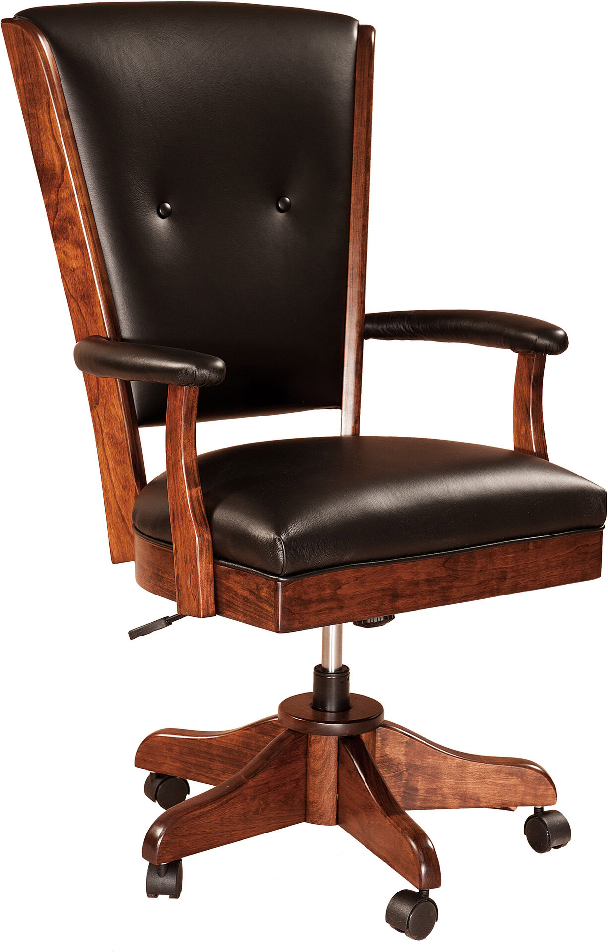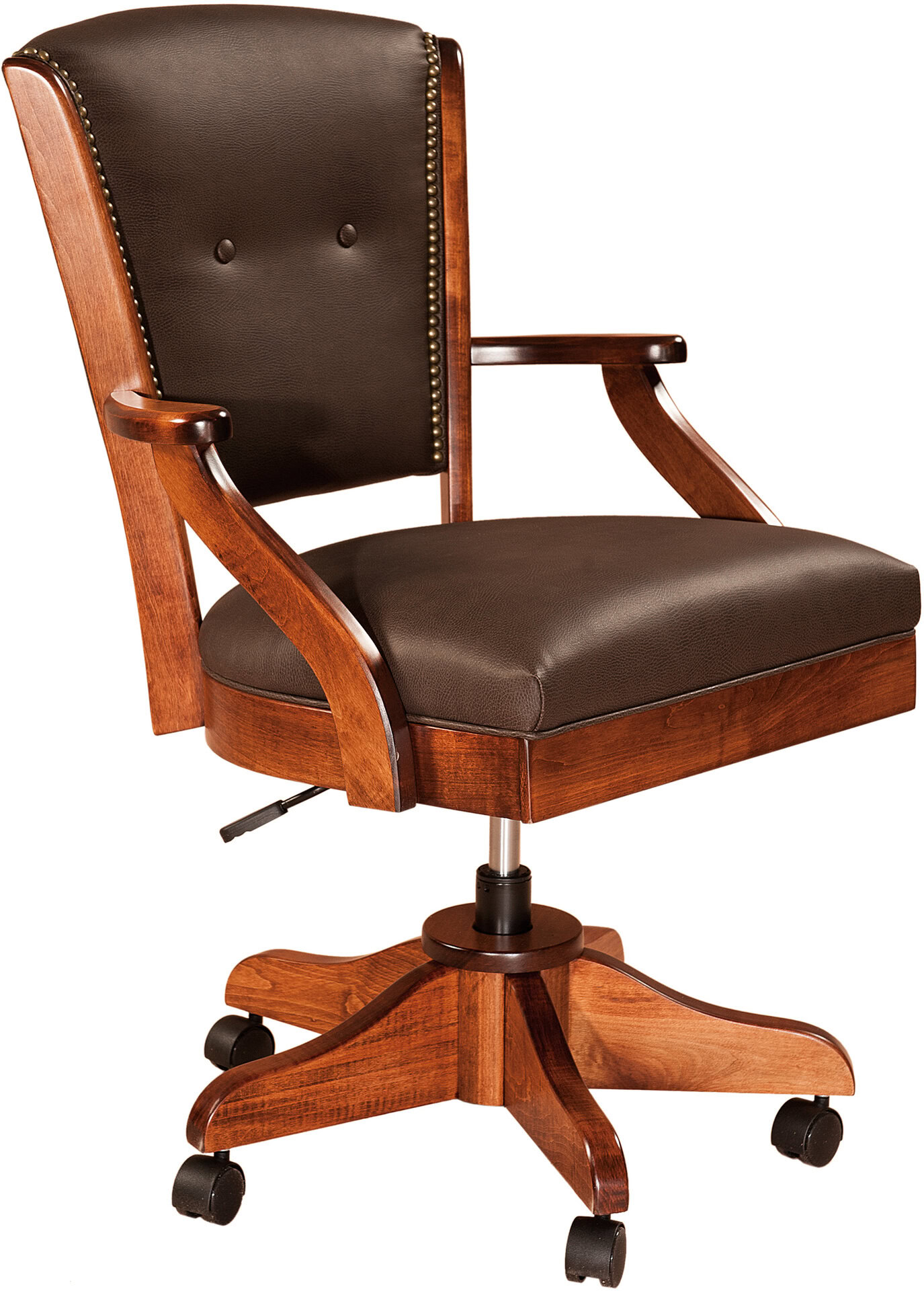 The desk chair delivers a number of features to enhance comfort and convenience. Like a solid hardwood base with quality casters. Plus adjustments for height and tilt. In addition, you can request a nail detail in the backrest plus short arms or fabric arms. And on the subject of fabrics, we have a huge selection from which to choose.
