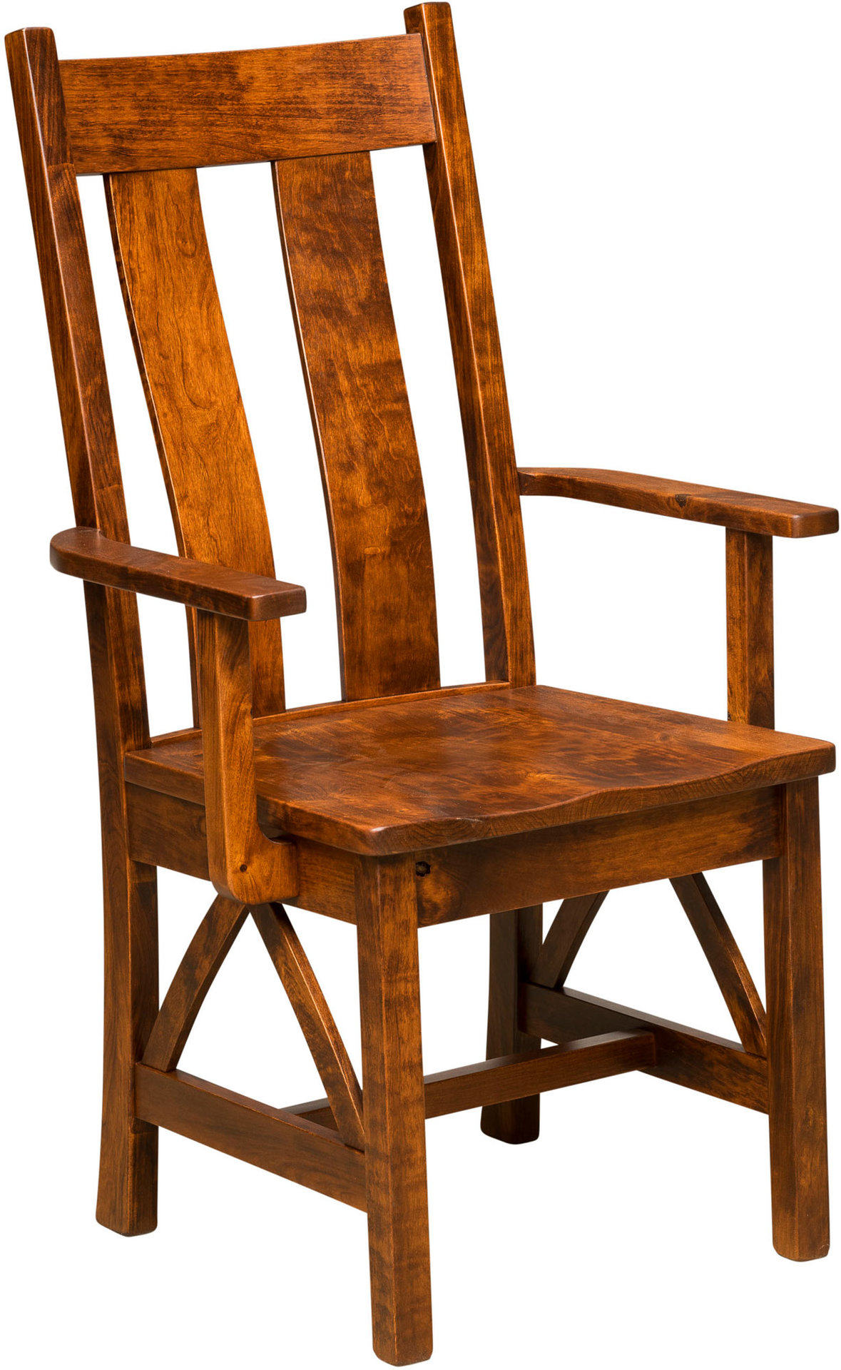 The two wide slats in the backrest first catch your eye on the Bostonian Dining Chair. Then, you notice the intricate cabinetwork in the base. And you think how great this chair will look surrounding your dining table! Indeed, the curved slats provide great lumbar support. While the saddle scoop seat enhances comfort. Also, you can order any combination of side chairs and armchairs. Amish cabinetmakers — the best in the Midwest — build the chair. And they use top hardwoods like cherry, oak and maple. No wonder the chair is so sturdy and heirloom-quality! Ready to order? Click the “Customize this product” button below. Then, fill out the customizing fields. Or call 877-357-2106.