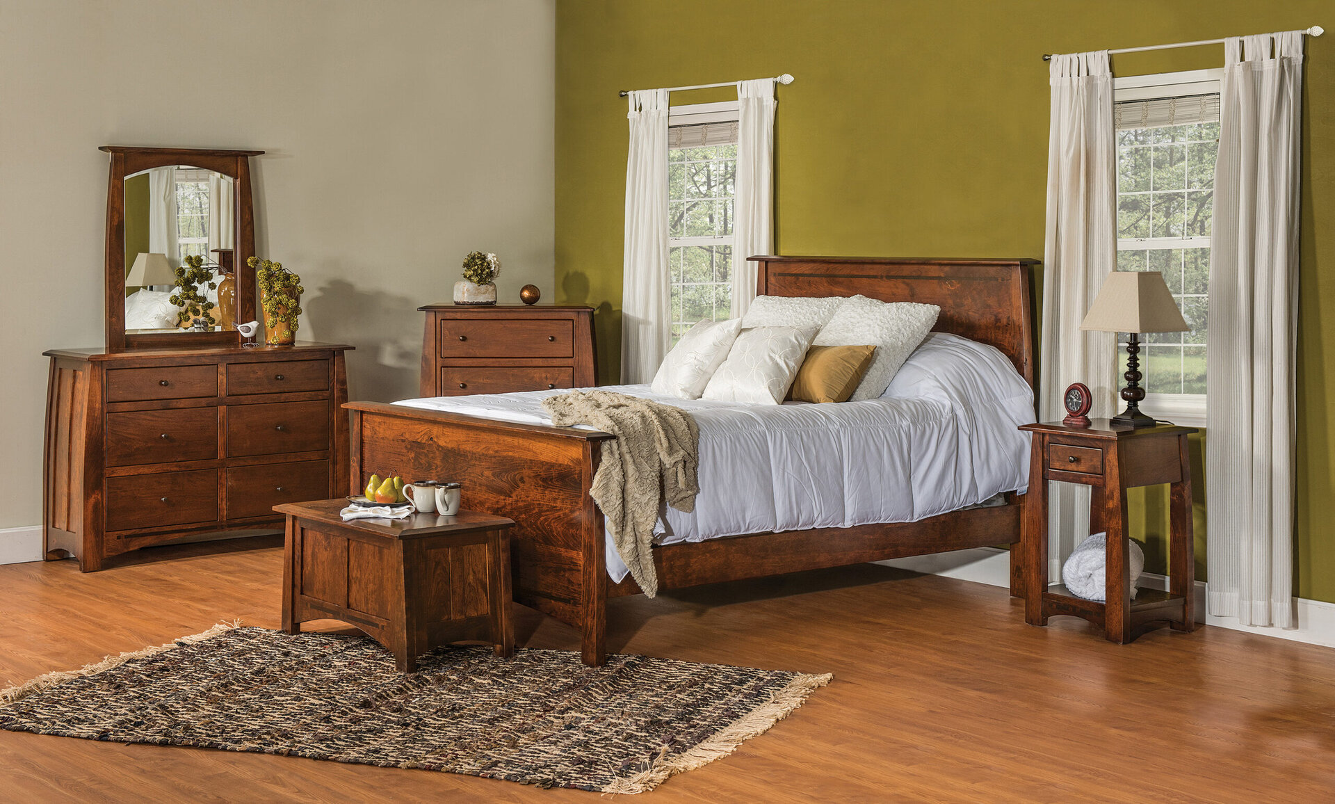 The Boulder Creek Style Cherry Bed delights the eye with its curved profile, recessed panels and ebony inlays. What a prestigious-looking piece for your master bedroom! We offer the bed in king, California king, full, twin and queen sizes (shown). So, you can order the size that best meets your needs and desires. Amish cabinetmakers — the best in the Midwest — build the bed. And they use top hardwoods like oak, maple and rustic cherry (shown with Burnt Umber stain). No wonder the bed is so sturdy and heirloom-quality! Ready to order? Click the “Customize this product” button below. Then, fill out the customizing fields. Or call 877-357-2106.