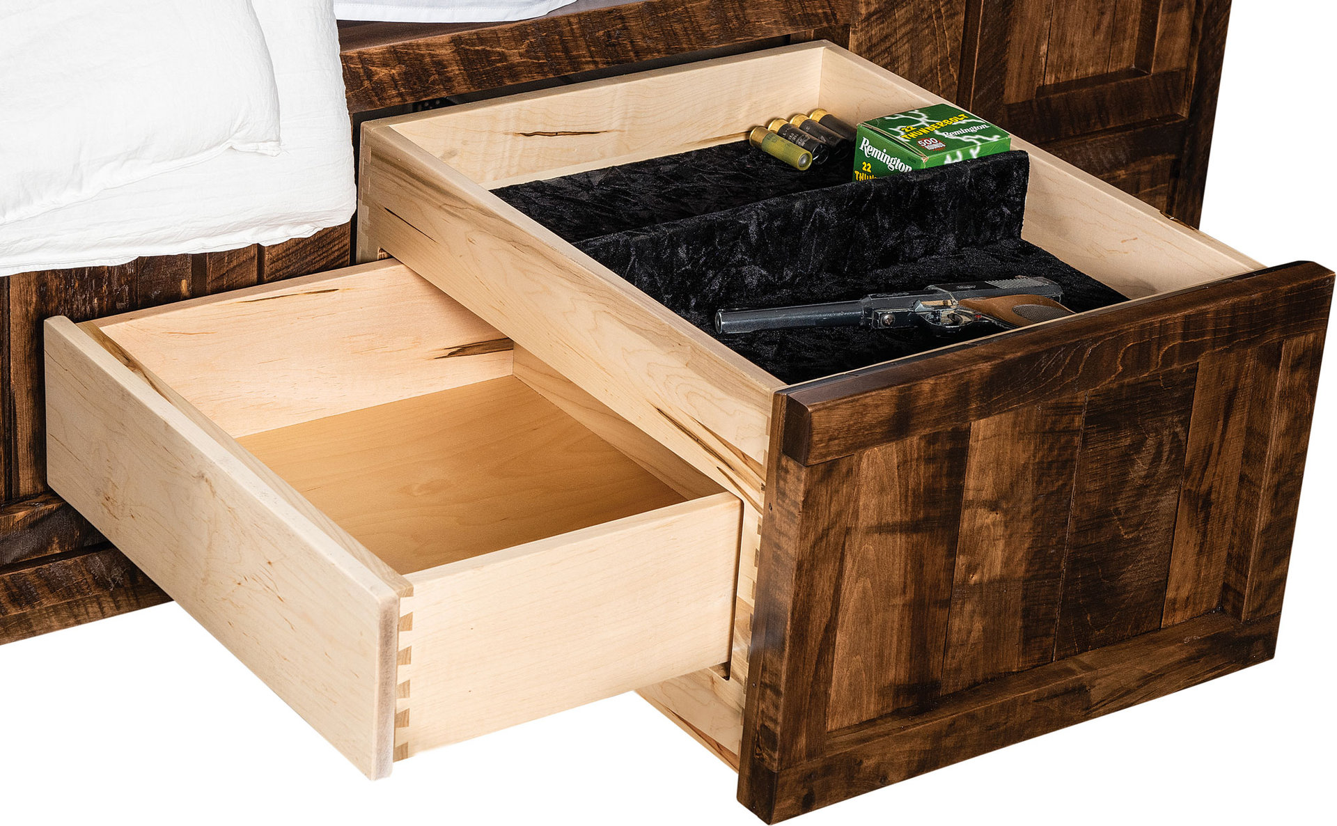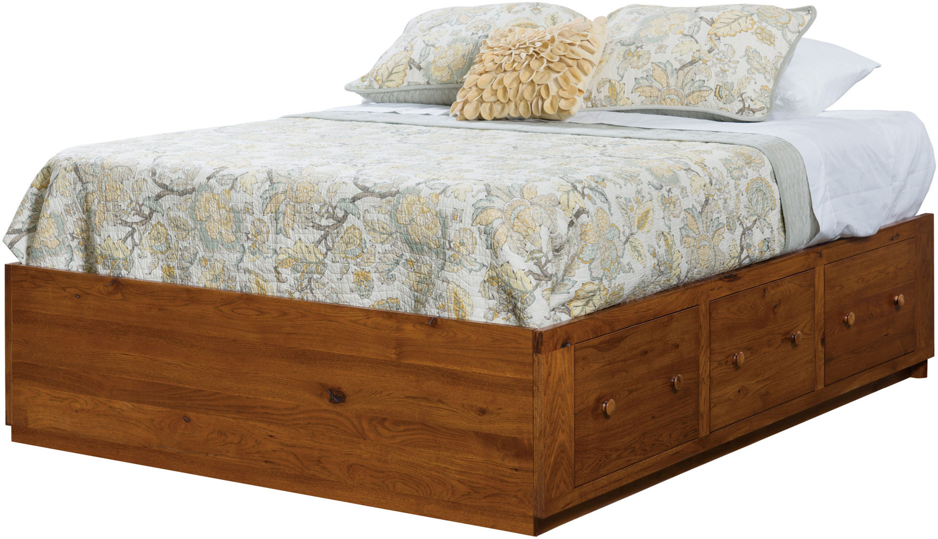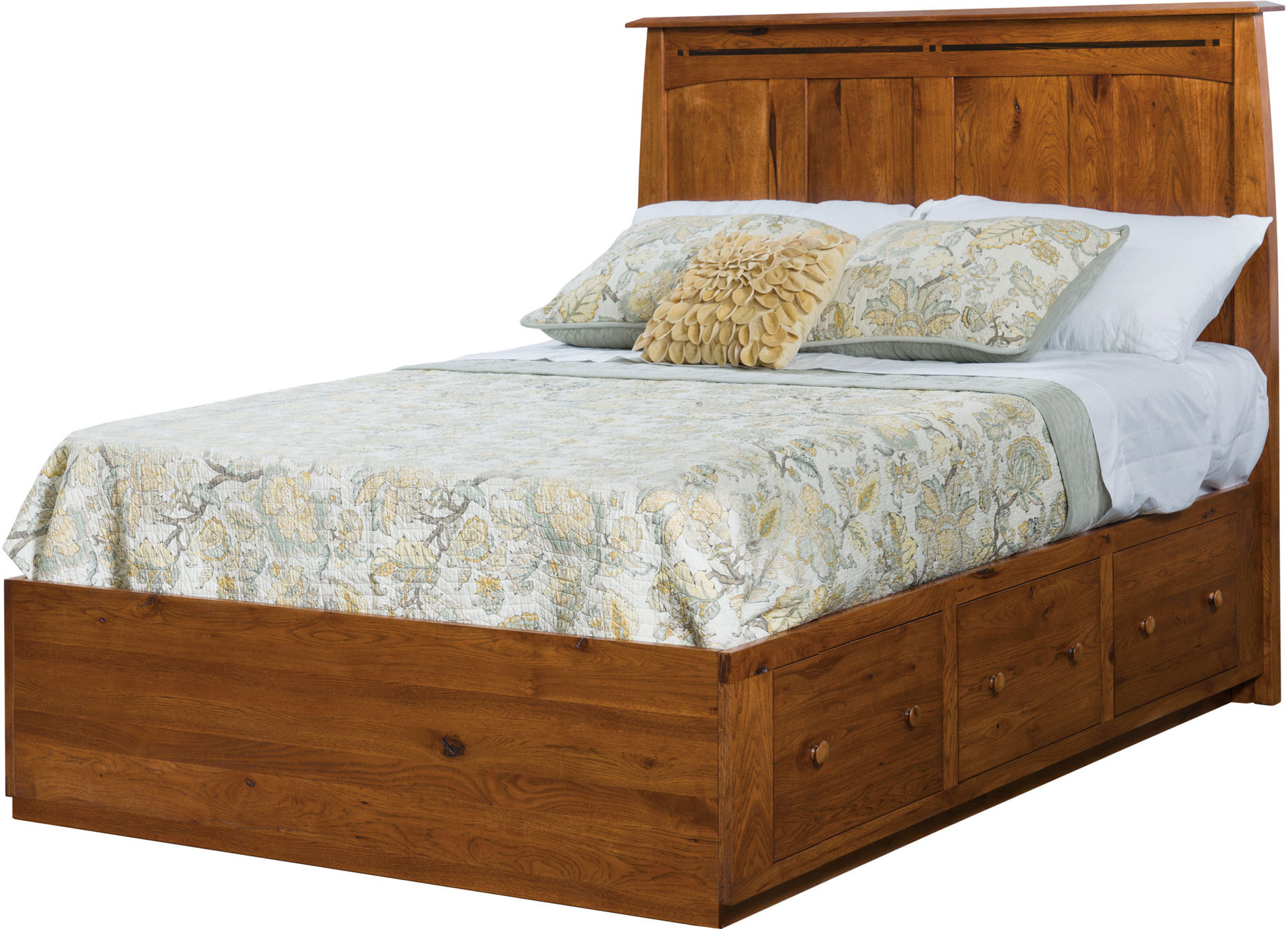 The classic features of the Boulder Creek design get added storage space in the Boulder Creek Style Platform Bed. Indeed, the recessed curved profile, raised panels and ebony inlays command attention. The drawers add convenient storage space. And you can request the combo treasure drawer. Plus, the drawers close with a gentle push. Amish cabinetmakers — the best in the Midwest — build the bed. And they use top hardwoods like oak, maple and rustic cherry (shown with Burnt Umber stain). No wonder the bed is so sturdy and heirloom-quality! Ready to order? Click the “Customize this product” button below. Then, fill out the customizing fields. Or call 877-357-2106.