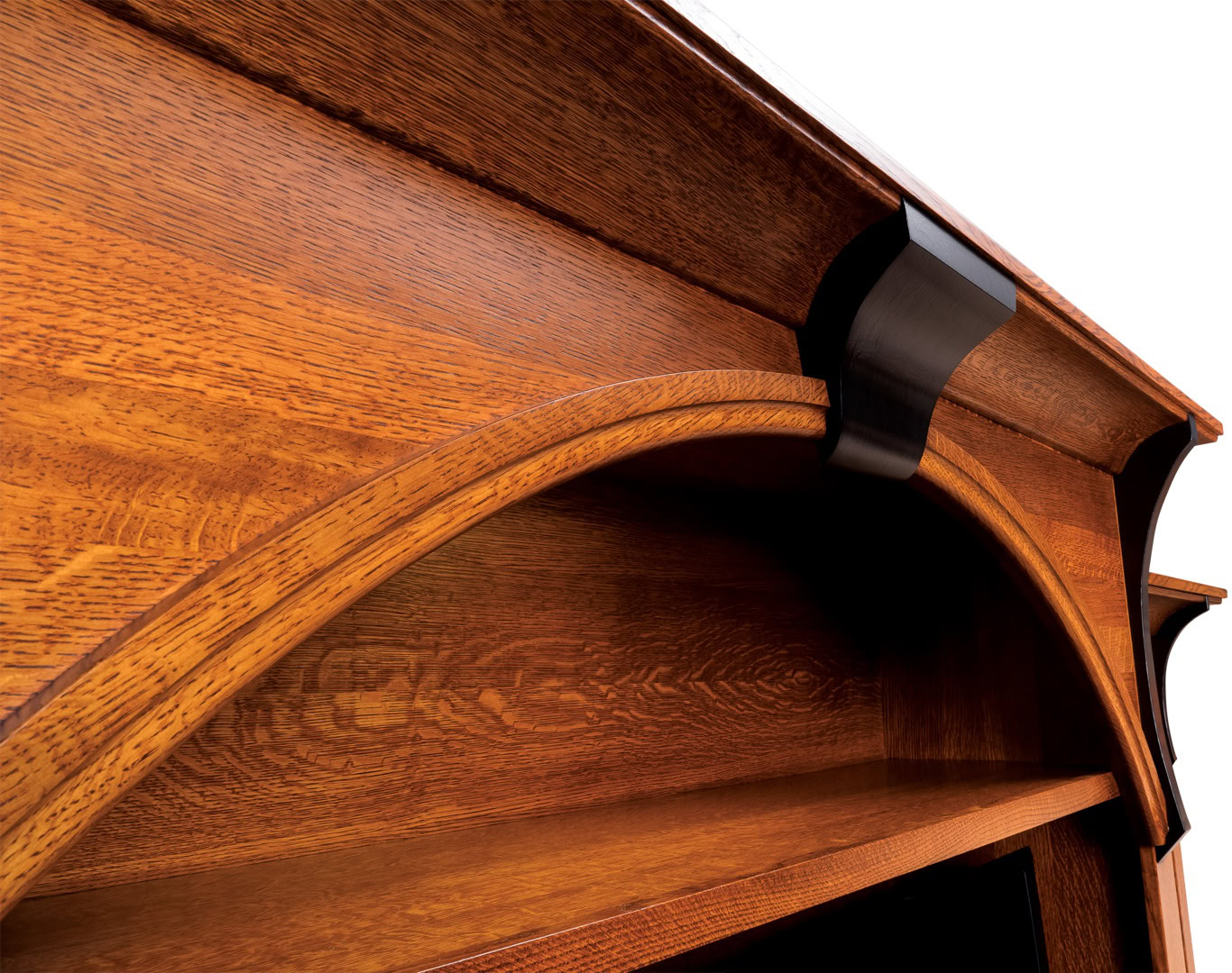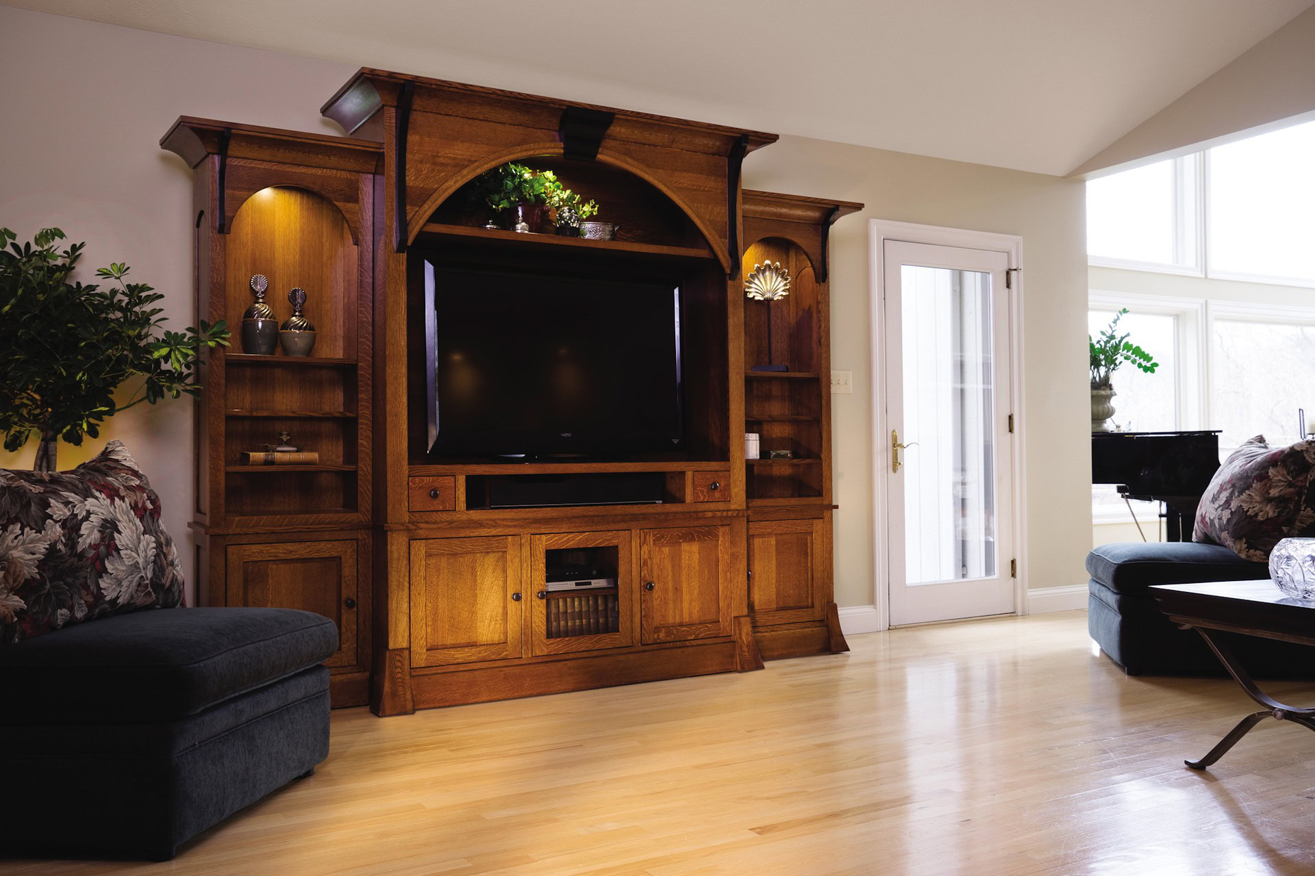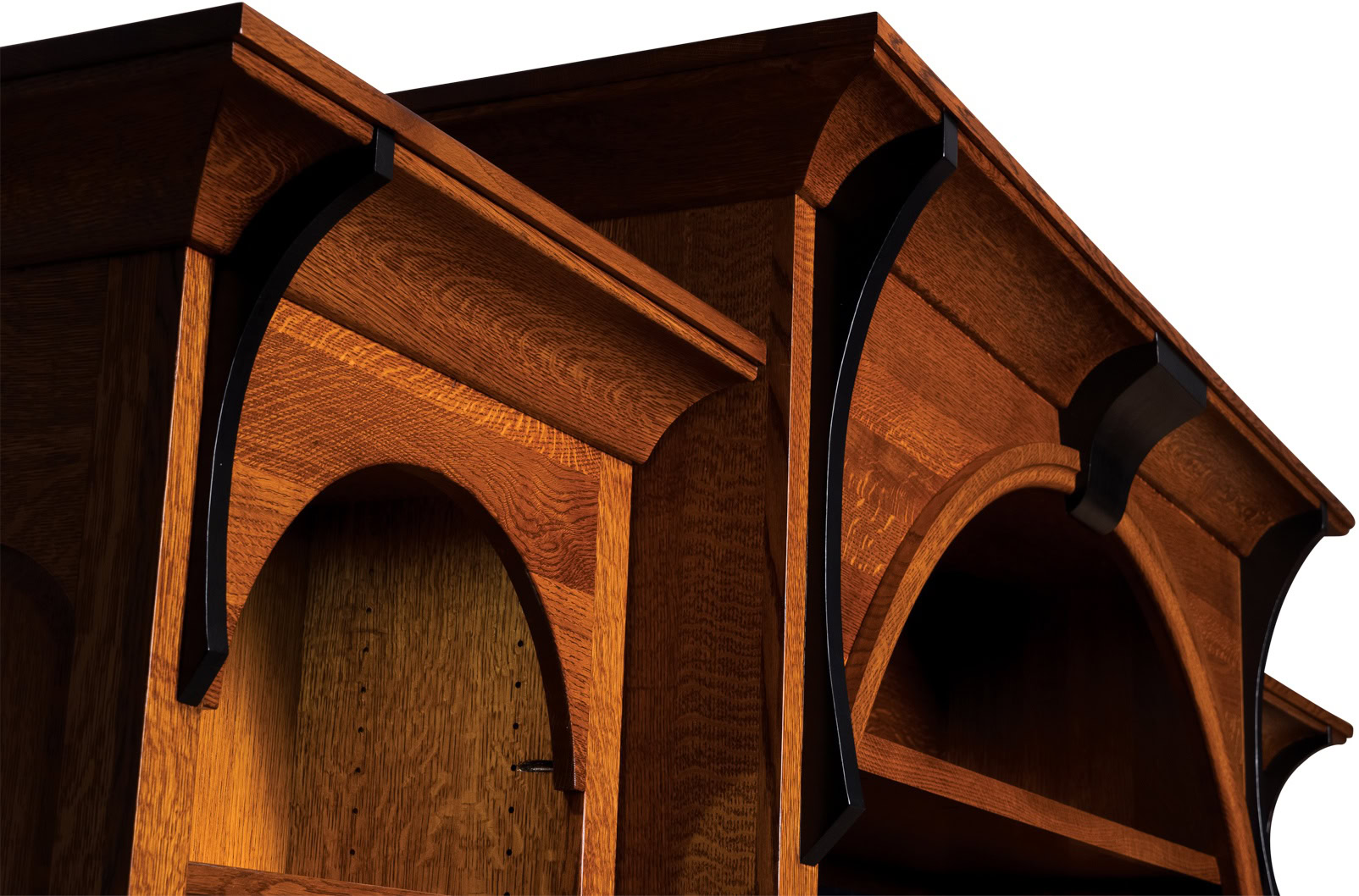 The Breckenridge TV Wall Unit provides a beautiful and practical storage option for all of your television and media accessories. Place your sound bar below the TV and your photos and decorative items on the side, adjustable shelves. You will love how the LED lights make your items stand out. Also, take notice of the stunning arched tops with black corbels. They will truly set this wall unit apart from all of the others. So, choose your favorite wood species and finish and soon you will be watching TV in this TV Wall Unit.