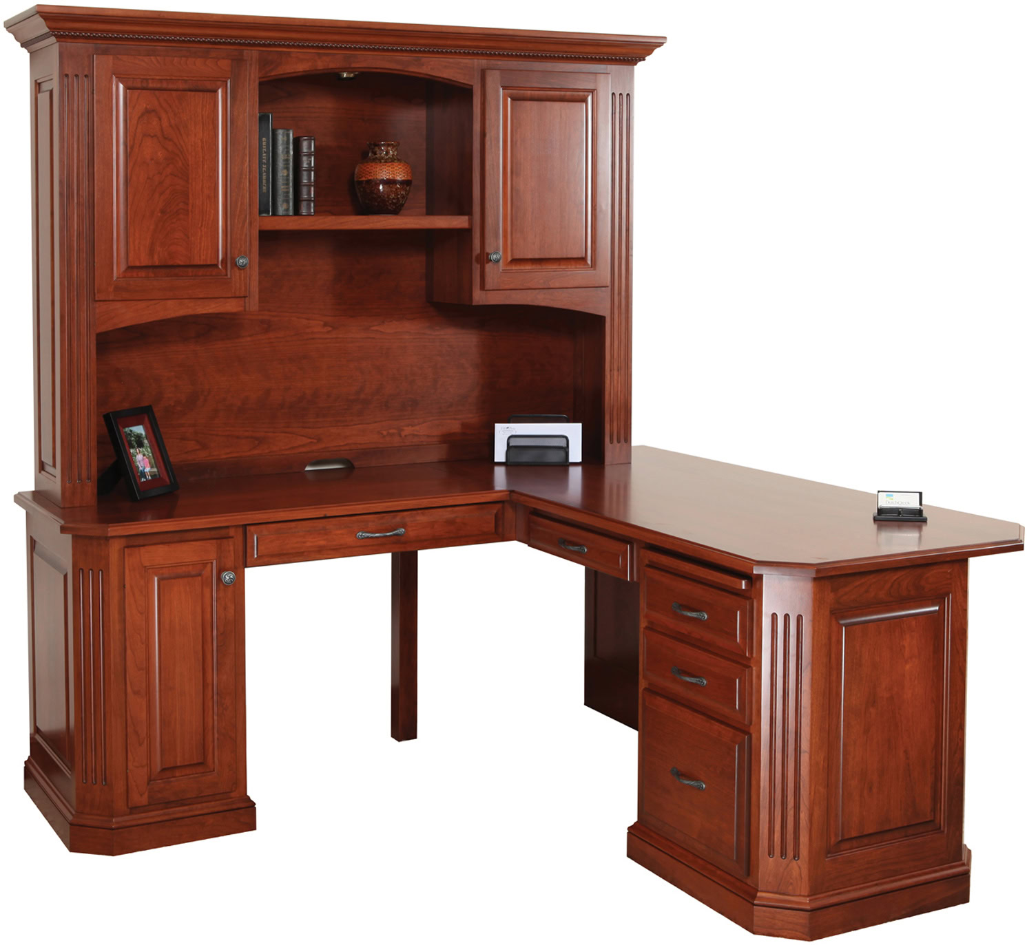 Presenting a breathtakingly beautiful, sophisticated, and well-appointed workstation for your home or business office. The Buckingham Corner L Desk with Hutch. With its impressive, L-shaped footprint and eye-catching palette of design features, this desk and hutch are unsurpassed in appeal. Check out its fluted corners and elegant raised panels. Also, notice the crown and base molding. Plus the rich finish.