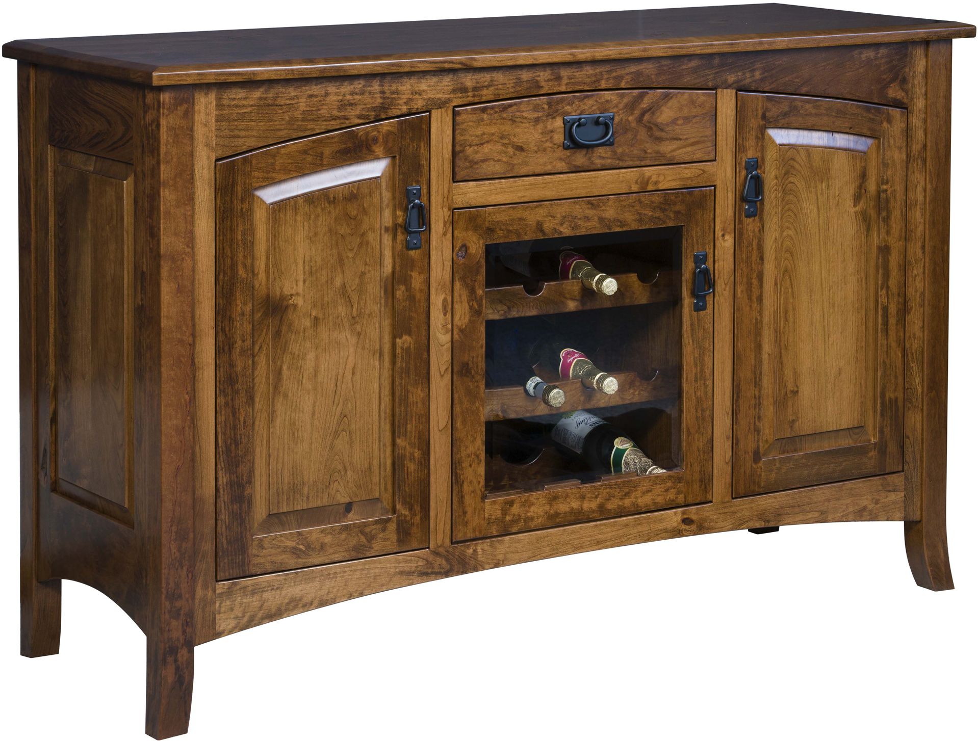 With its spectacular design and superb cabinetmaking, the Cambria 3-Door Sideboard will enhance the upscale appeal of your dining room. The arch design catches the eye. So do the black pull hardware and the flush, beveled glass door. Or, you can choose a wine rack behind the center door. In addition, the drawer opens full extension, giving you easy access to all the items inside. Amish cabinetmakers — the best in the Midwest — build the buffet using top hardwoods like oak, maple and cherry. No wonder the sideboard is so sturdy, it’s heirloom-quality! Ready to order? Click the “Customize this product” button below. Then, fill out the open (blank) fields. Or call 877-357-2106 today.