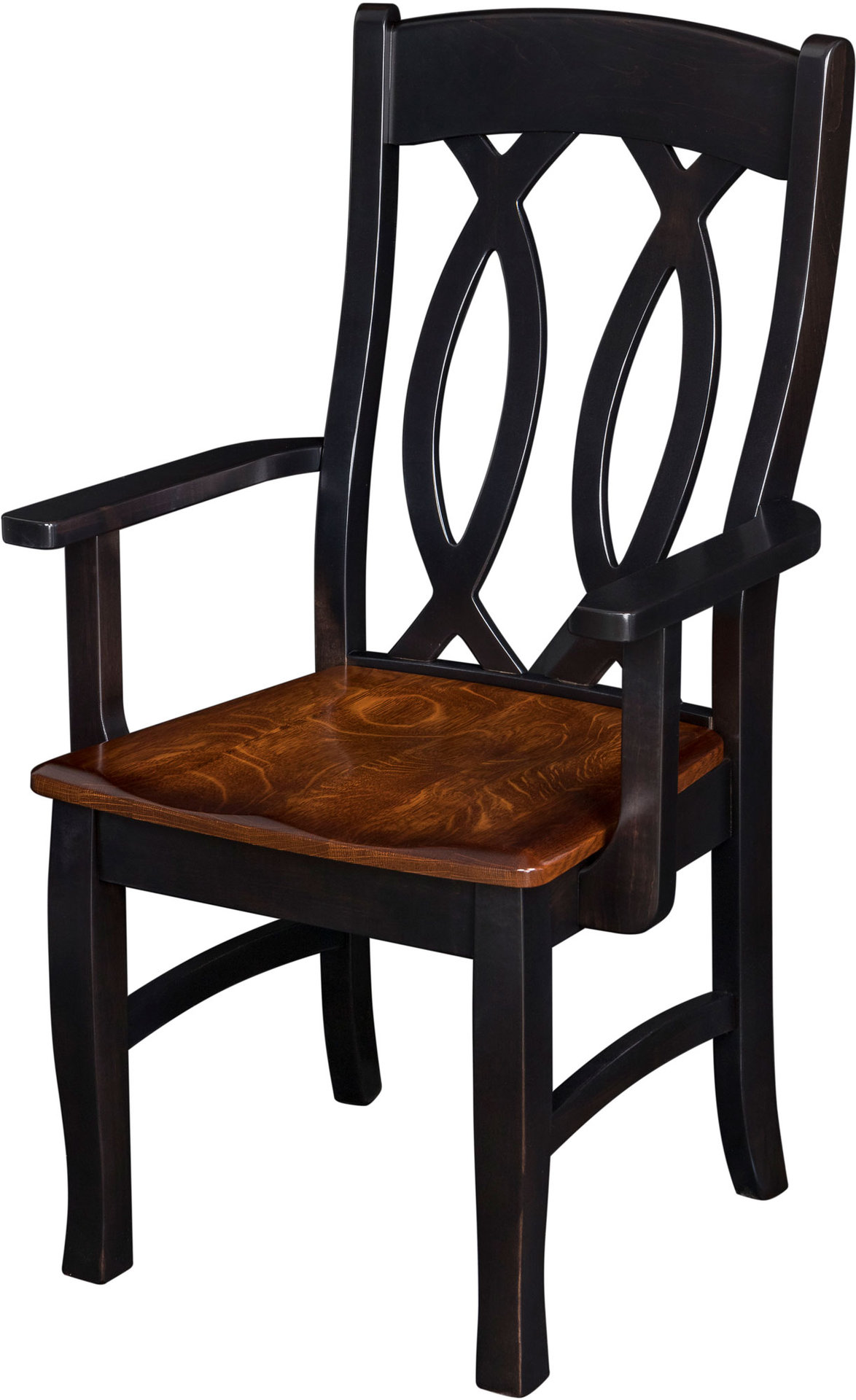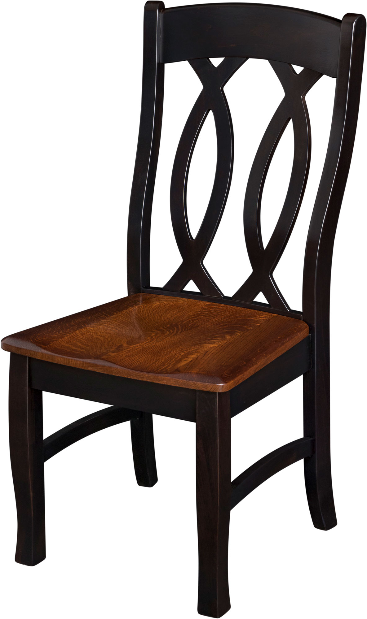 The Cambria Dining Chair integrates an ornate pattern into the backrest, with the same curved feature extending to the base down below. Imagine this lovely chair with its exclusive design around your dining table! The scoop seat enhances comfort. Amish cabinetmakers — the best in the Midwest — build the chair. And they use top hardwoods like oak, cherry and maple. No wonder the chair is so sturdy and heirloom-quality! Are you ready to order? Simply click the “Customize this product” button below. Then, fill out the open (blank) fields. Or call 877-357-2106 today.