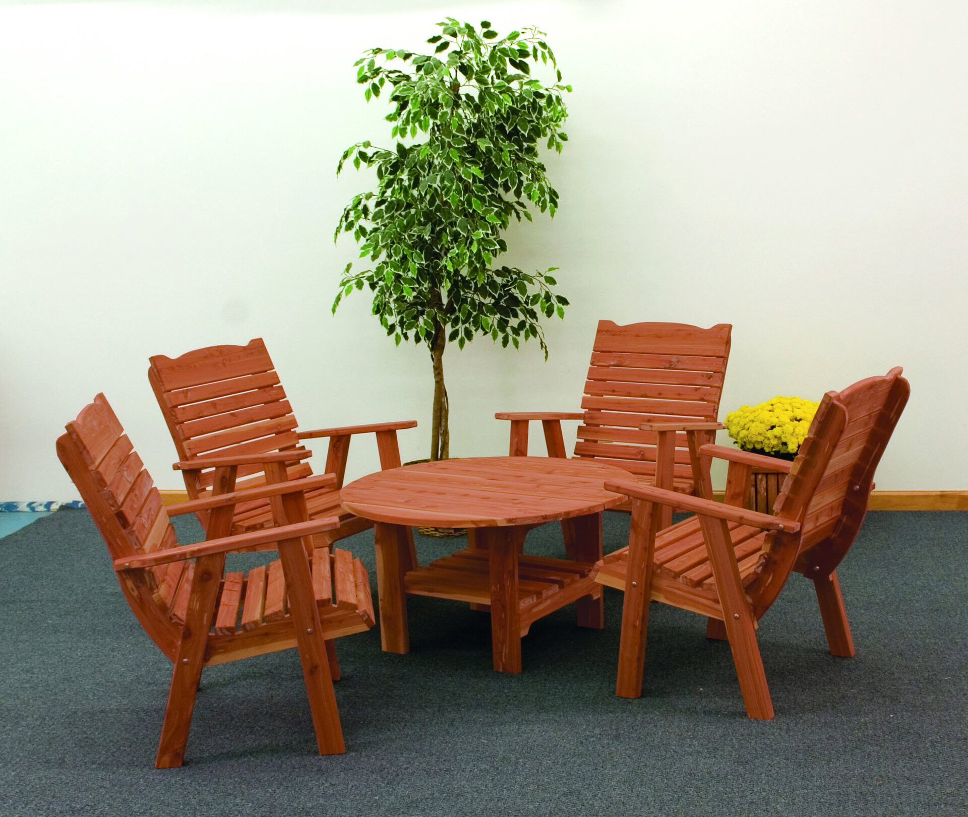 The Cedar Chat Table Set is just the right height for holding snacks at a pool-side party or playing cards out on the patio. Set includes a round table and four Straight Back chairs.