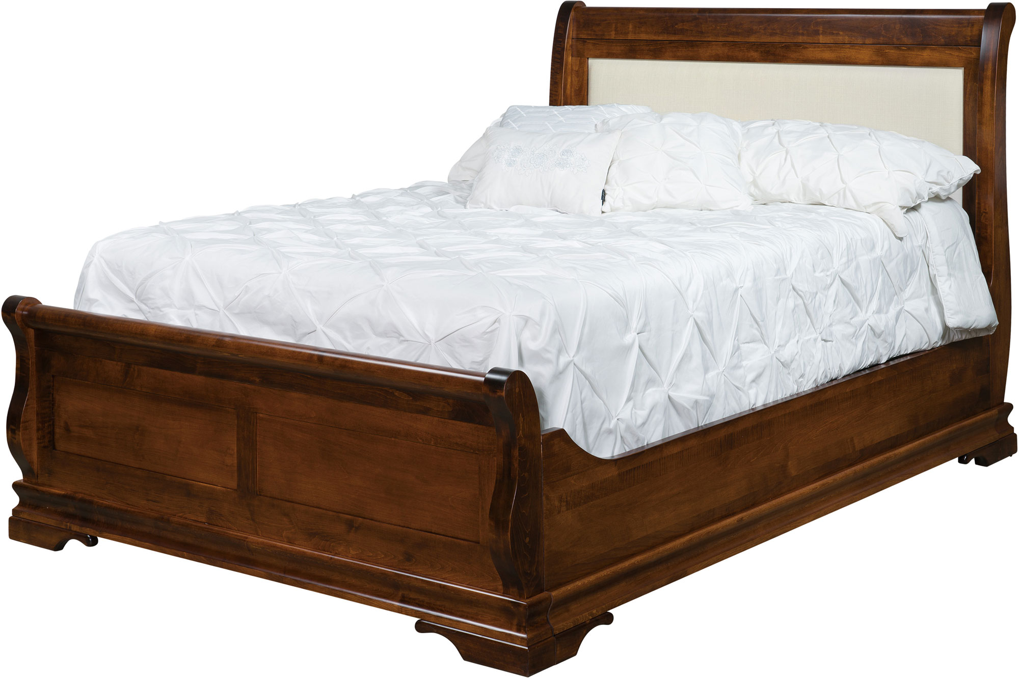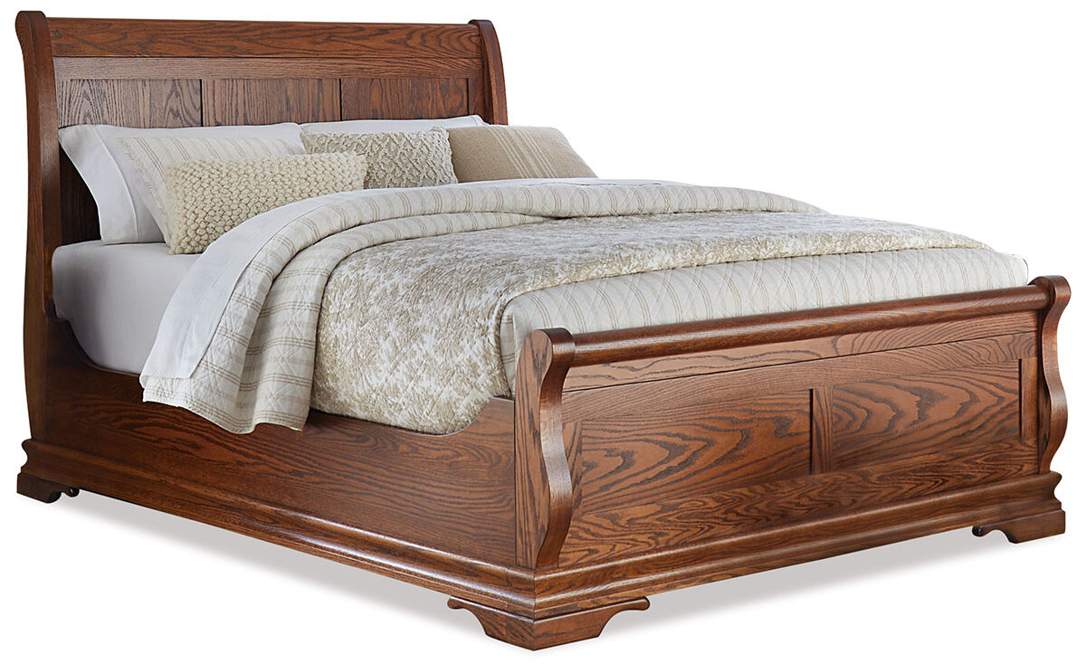 With the headboard and footboard rising from a molded base, the Chippewa Hardwood Sleigh Bed features the flowing curves you’ll see on a sleigh. Also, check out the carved feet. Plus the recessed panels. Now, imagine this eye-catching piece in your bedroom! Amish cabinetmakers – the best in the Midwest – build the bed. And they use top hardwoods like cherry, maple and oak (shown). Our builders also use tried-and-proven skills handed down from their ancestors in the old country. No wonder the bed is so sturdy – and heirloom-quality! Ready to order? Click the “Customize this product” button below. Then, fill out the open (blank) fields. Or call 877-357-2106.