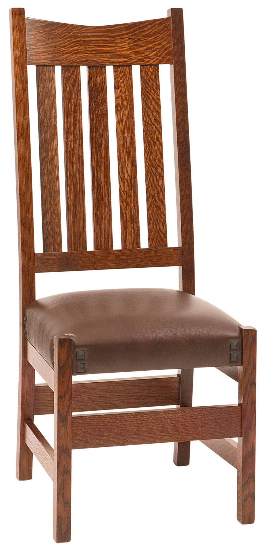 Looking for a dining room chair with a distinct ‘old world’ feel? The Conner Chair has it all. Check out the tall back with the five wide slats. Also notice the plush upholstered seat, complete with decorative metal tacks. We have different leather options, plus a plethora of fabrics to choose from.