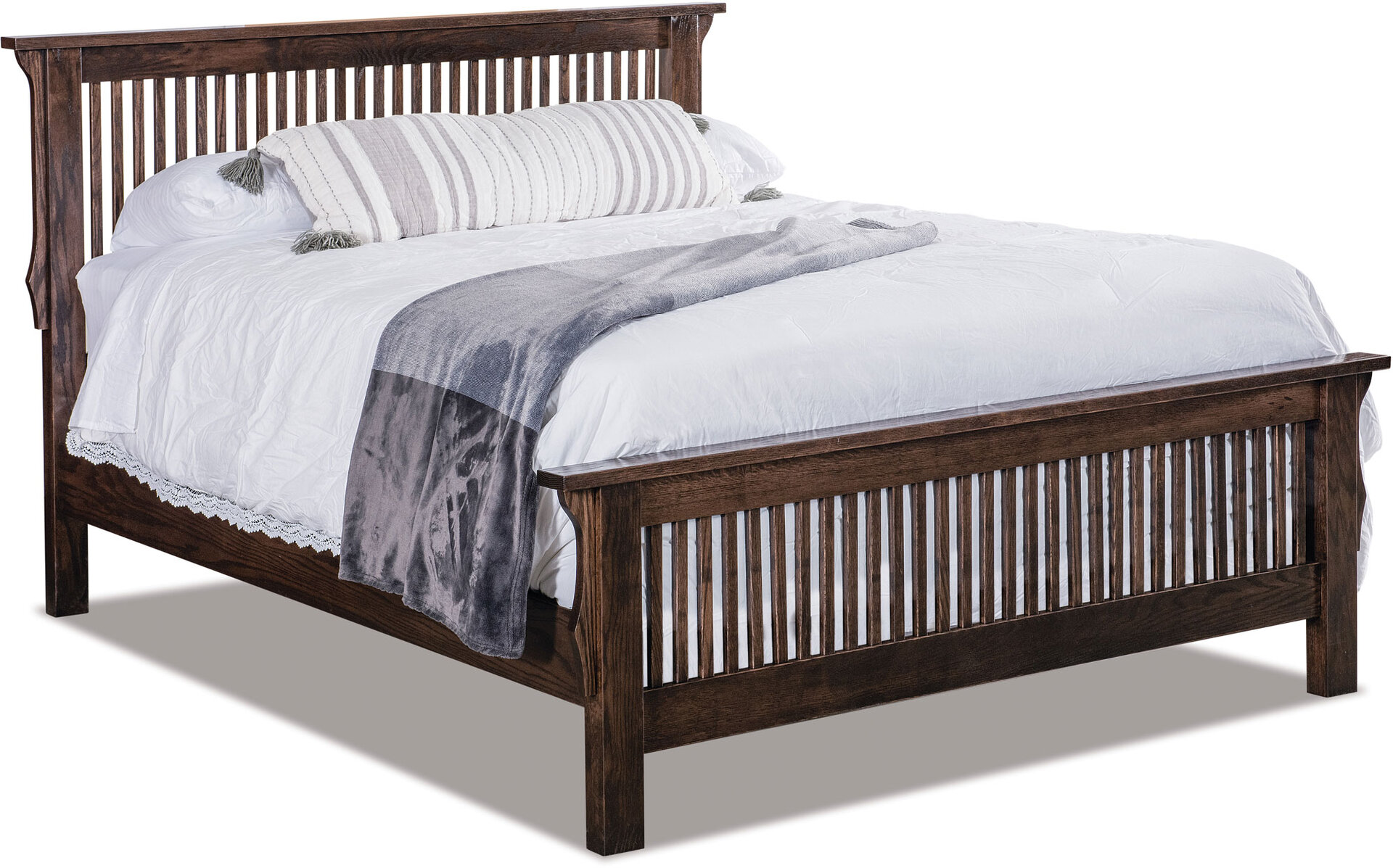 With its low-profile headboard and footboard, intricately handcrafted slats and decorative corbels, the Deluxe Stick Mission Bed catches the eye. What a beautiful choice for your master bedroom! We offer the bed in king, California king, full, twin and queen sizes (shown). So, you can choose the size that best meets your needs and desires. Amish cabinetmakers — the best in the Midwest — build the bed. And they use top hardwoods like cherry, maple and oak (shown with Charwood Stain). No wonder the bed is so sturdy and heirloom-quality! Ready to order? Click the “Customize this product” button below. Then, fill out the customizing fields. Or call 877-357-2106.