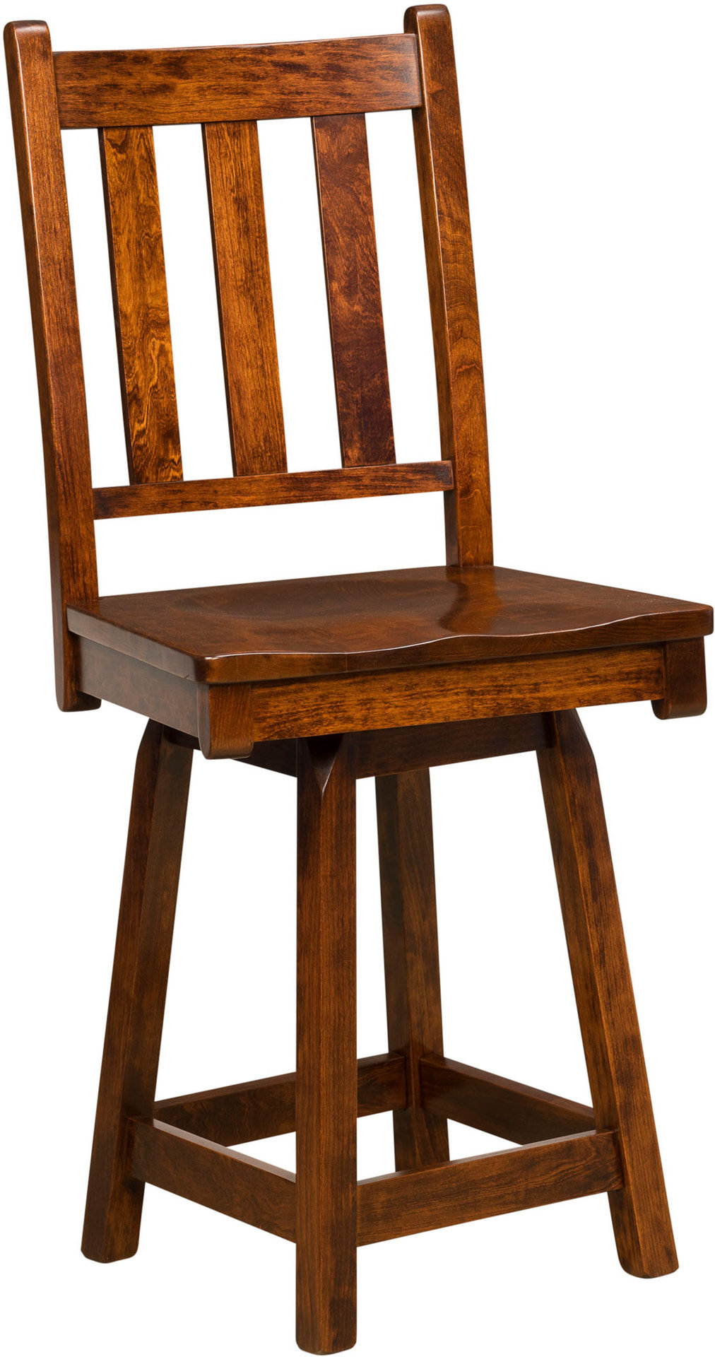 With its stately Mission style and solid hardwood cabinetry, the Denver Bar Chair will enhance the comfort, convenience and decor of your breakfast counter, kitchen island or in-home bar. The wide slats provide great back support. While the saddle scoop seat enhances comfort. Want even more comfort? Request an upholstered seat finished in fabric or leather. Also, you can order your set of barstools in any combination of stationary and/or swivel designs. Amish cabinetmakers — the best in the Midwest — build the bar chair. And they use top hardwoods like cherry, oak and maple. No wonder the piece is so sturdy and heirloom-quality! Ready to order? Click the “Customize this product” button below. Then, fill out the customization fields. Or call 877-357-2106.