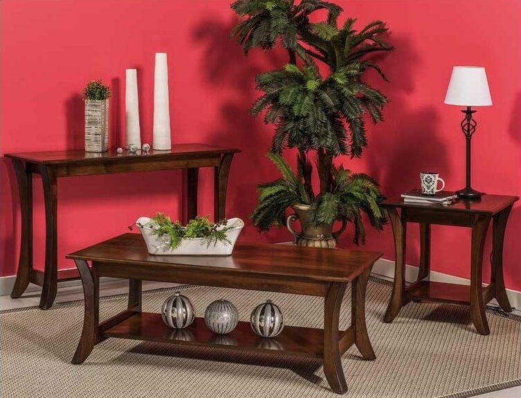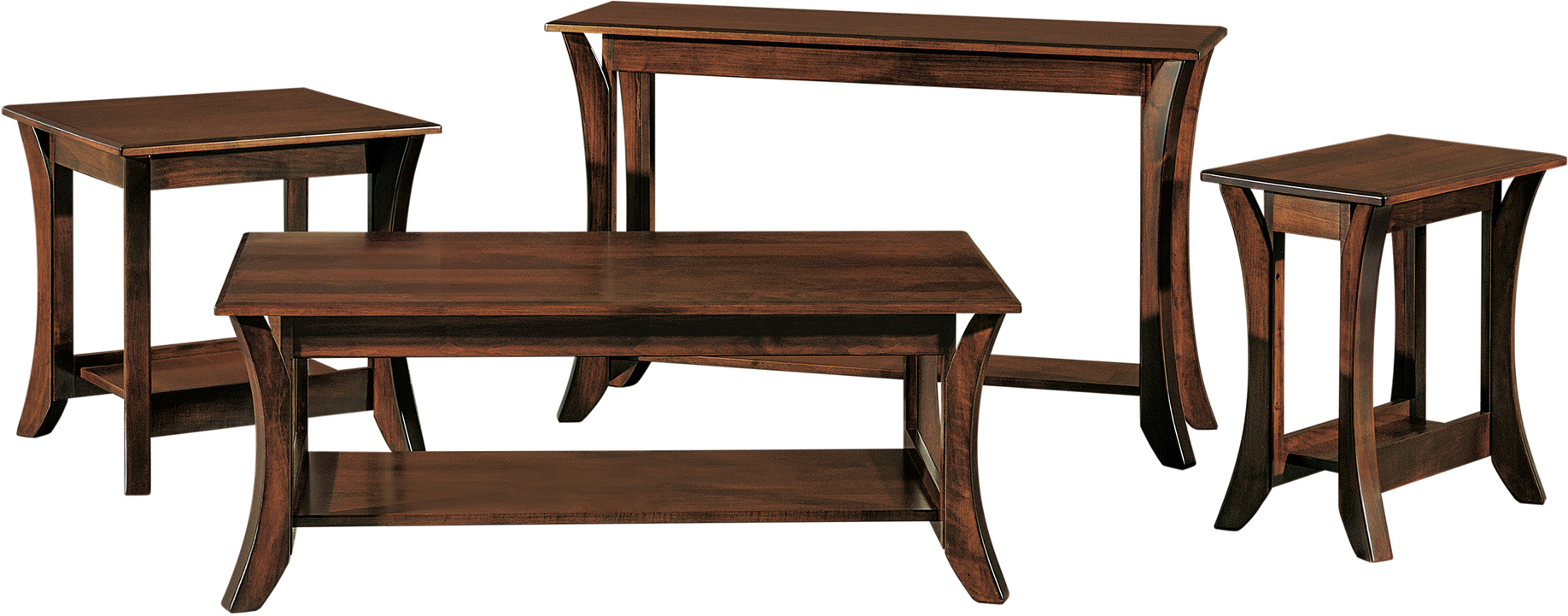 The Discovery Occasional Table Set boasts a simple, clean design with a rich, stylish finish. The unique curved leg details of the hardwood tables creates a modern style on these classic pieces. In addition, we design the tables with solid hardwood. This allows the furniture to last for years to come. Also, the tables offer an open shelf in the base to display your décor and keep your table top free of clutter. The table collection includes a coffee table, two end tables, and a sofa table to fit your family room perfectly. This set is offered only in Brown Maple, but you can choose from a variety of stain colors to match your family room style and décor.
