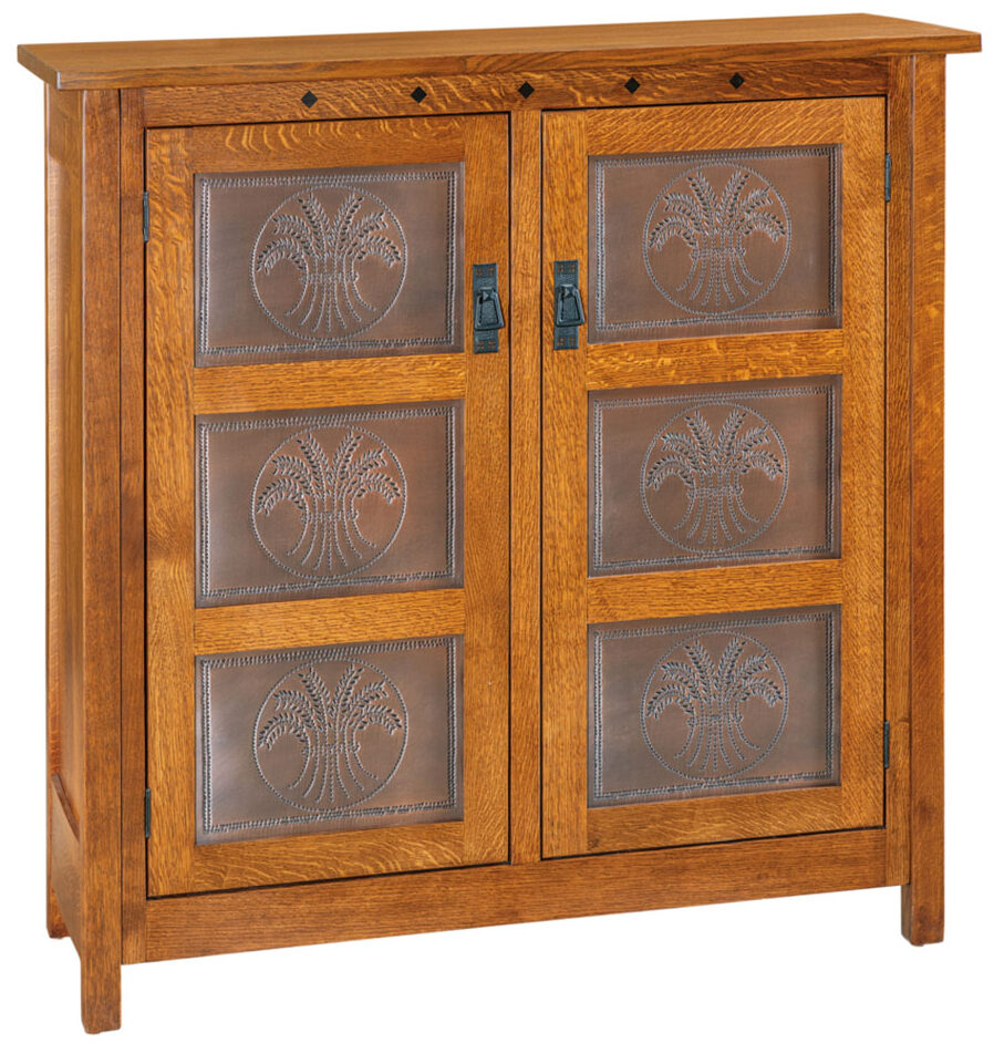 Enjoy a classic farmhouse feel and great pantry storage with the Dynasty Mission Two-Door Pie Safe. Check out the copper panel doors — complete with etched sheaves. They’re reminiscent of simpler times in rural America. Also, the diamond inlays and black Mission pull hardware enhance the visual appeal.
