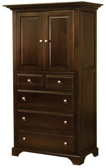 The Escalade Armoire delights the eye with its raised panel doors, drawers and sides, plus the rich finish offset by brass hardware. What a great storage space for your bedroom items! You’ll find an adjustable shelf and a rod for hanging clothes behind the doors. The five spacious drawers open full-extension for easy access. Plus, the dovetail drawer joints enhance strength. Amish artisans build the armoire. And they use real hardwoods. Like cherry, maple and oak. So, the armoire is sturdy and heirloom-quality! A three-drawer version with more top storage space is available. To order, click the “Customize this product” button below. Then, complete the “Customize Product” fields. Also click the “Get your customized quote” button. Or call 877-357-2106.