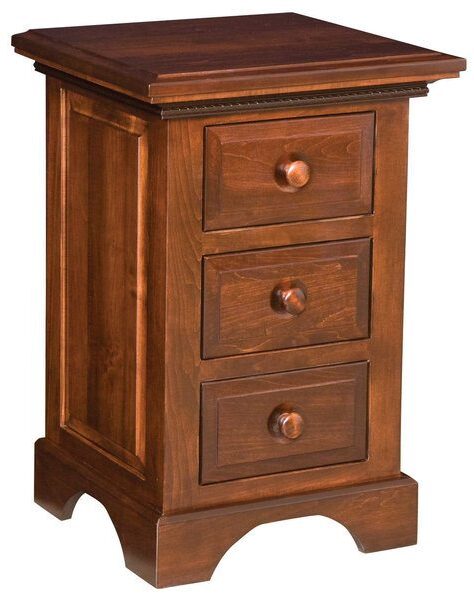 The Escalade Three Drawer Nightstand features a slim profile and a well-filled-out list of features. Like the raised panel sides and drawer fronts. Plus the inset round wood knob hardware. The drawers open full-extension. So, you’ll enjoy easy access to what’s inside. Even items at the back. While dovetail drawer joints enhance strength. Amish cabinetmakers – the best in the Midwest — build the nightstand. And they use top woods. Like cherry, maple and oak. So, the piece is sturdy and heirloom-quality! To order, click the “Customize this product” button below. Then, fill out the “Customize Product” fields. Also click the “Get your customized quote” button. Or call 877-357-2106.