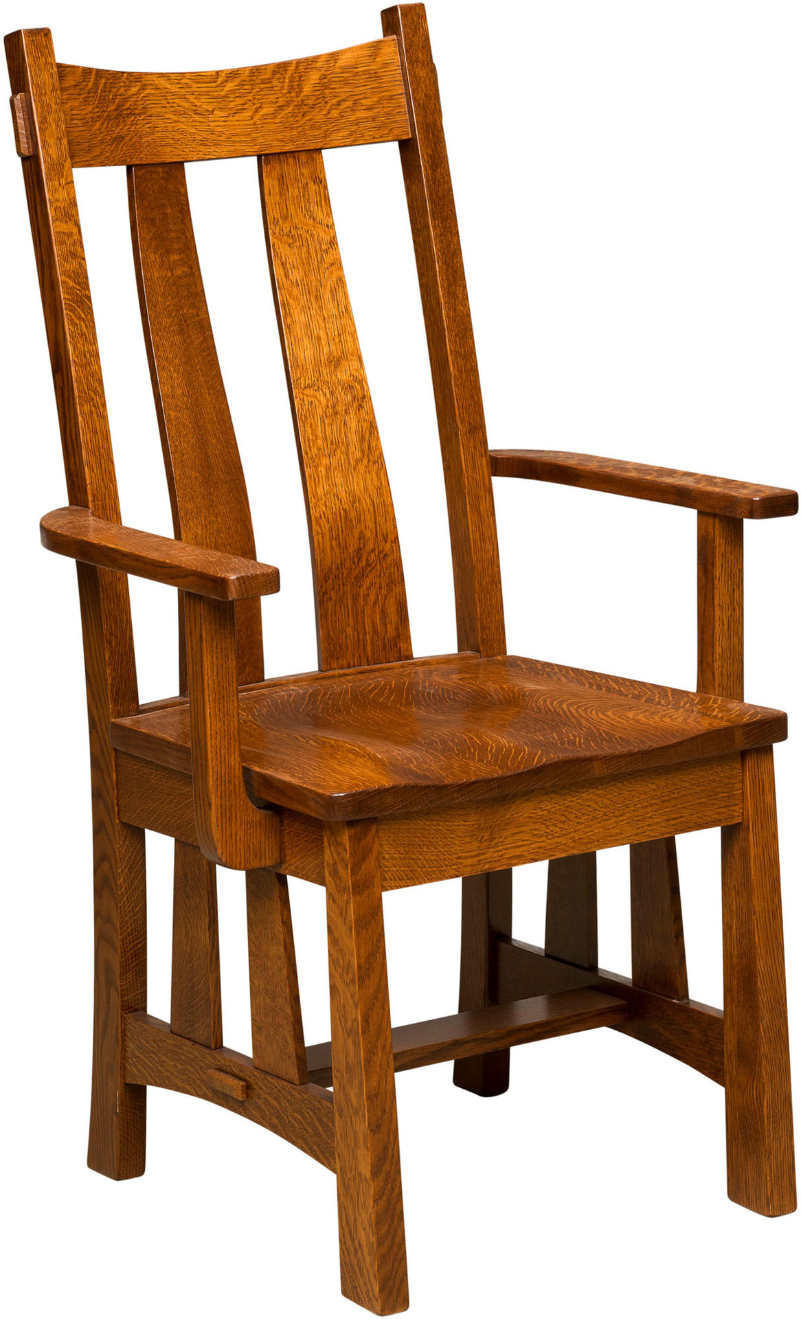 With its tapered slats and legs plus visible tenons, the Fremont Dining Chair complements your upscale dining table. What a stately chair for your more formal dining room! The curved backrest slats help with lumbar support. While the saddle-scoop seat provides extra comfort. You can order this chair in your favorite combination of side chairs and armchairs. Amish cabinetmakers — the best in the Midwest — build the chair. And they use top hardwoods like cherry, maple and quarter-sawn white oak (shown with Michael’s Cherry stain). No wonder the chair is so sturdy and heirloom-quality! Ready to order? Click the “Customize this product” button below. Then, fill out the customization fields. Or call 877-357-2106.