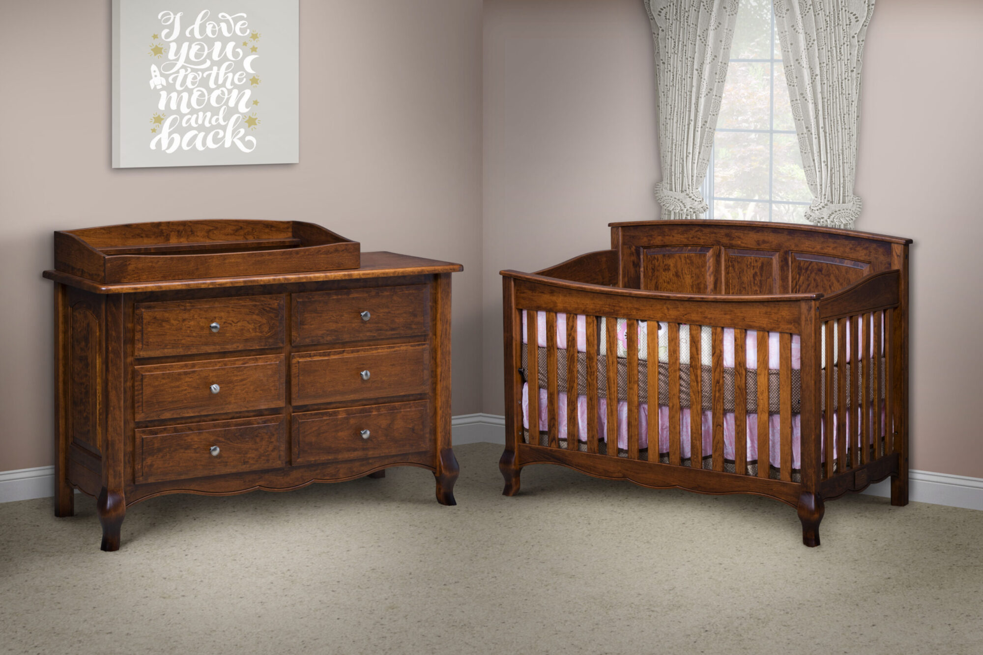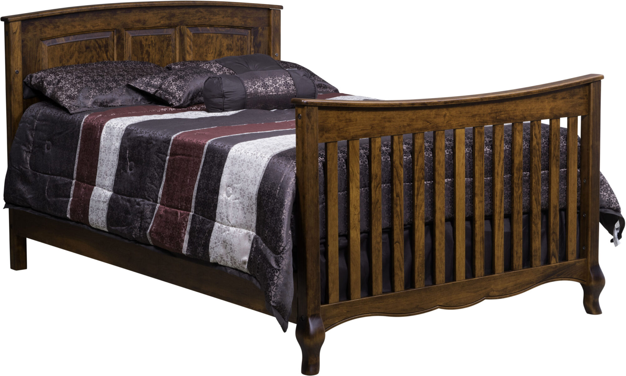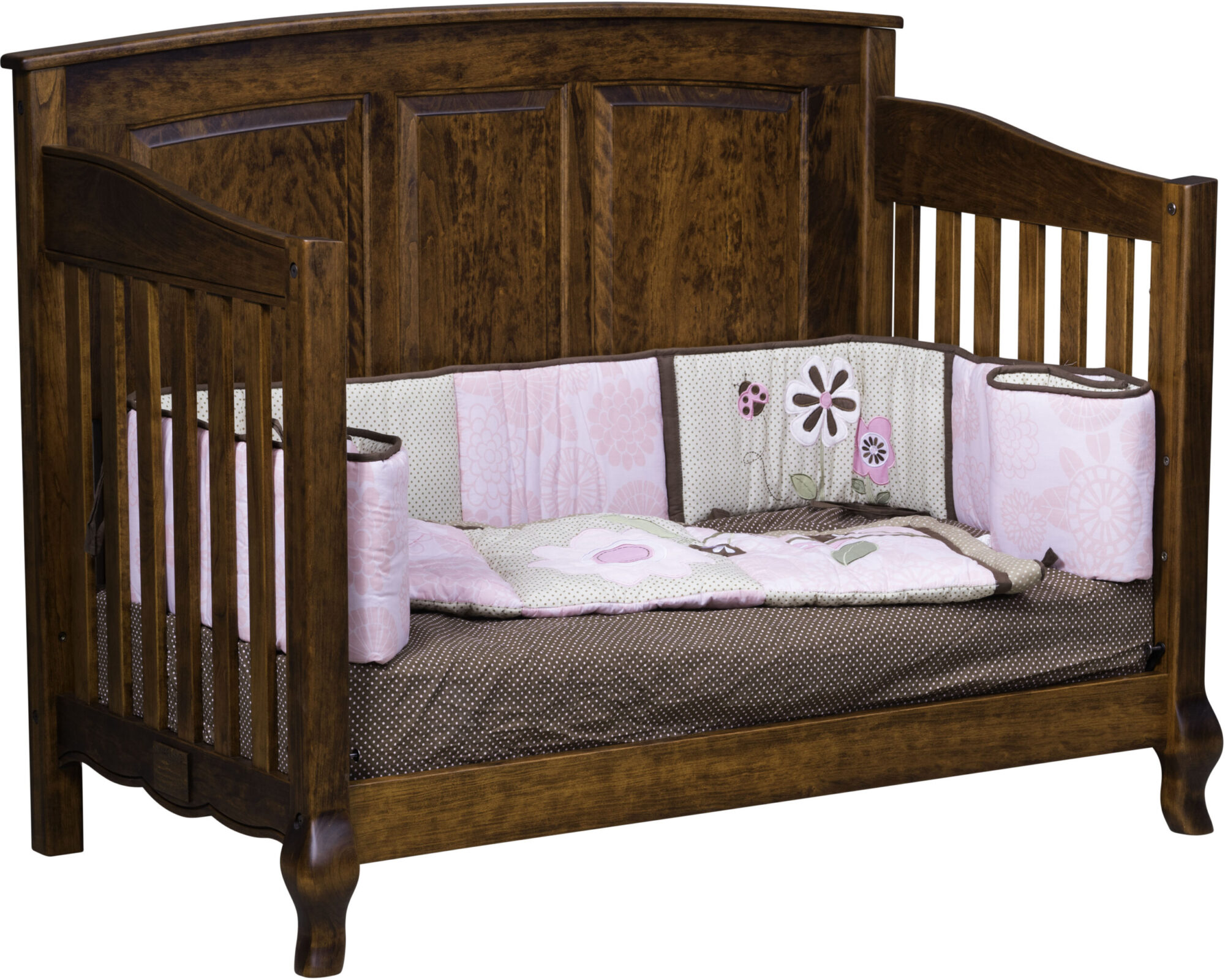 The French Country Convertible Crib is a beautiful gift that will continue to grow with any child. The crib style features two French style legs and a scalloped base. Also, the elegant raised panel back makes the crib truly unique. The crib has 3 adjustments for the mattress height. The mattress can be lowered as the child grows. In addition to the standard crib, this handcrafted masterpiece can turn into a day bed and eventually a full size bed. Another way the set can grow with the child is with the addition of matching dressers, nightstands, and chests. The quality of this bedroom furniture will last a lifetime.