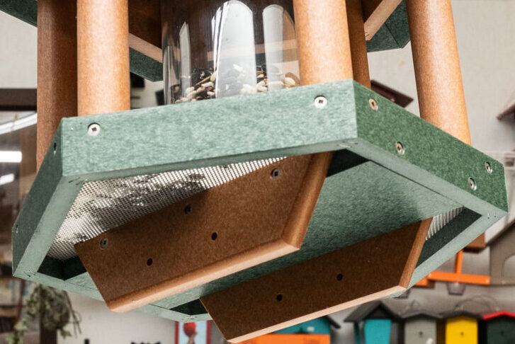 Imagine seeing lots of birds feeding and hanging out in a cute little house just outside your window. That’s what’s in store for you with the Gazebo Bird Feeder. The post-mounted feeder holds up to two pounds of feed. And it’s large enough to accommodate lots of birds. Amish artisans build the feeder from 100% post-consumer recycled plastic. So, it’s durable and termite-resistant. Also, we use stainless screws. These features make the feeder largely maintenance-free. Ready to order? Click the “Customize this product” button below. Then, fill out the open (blank) fields. Or call 877-357-2106.