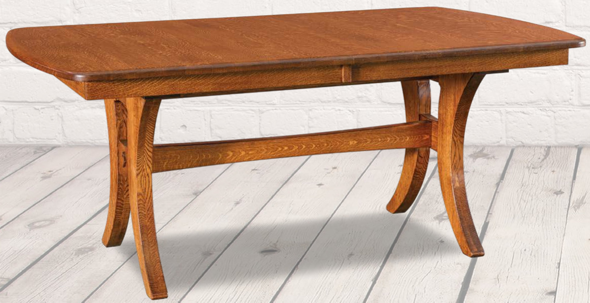 The Gemma Trestle Table catches the eye with its bowed trestle base and 1-inch-thick solid hardwood top with bow ends. What a grand table to serve as the centerpiece of your dining room! There’s room for up to four self-storing leaves just below the tabletop. So, you’re all set to entertain family and friends. Also, the table is built with quarter-sawn oak – and finished with Michael’s Cherry stain. No wonder it’s so beautiful, sturdy – and heirloom-quality! We offer the table in widths of 42 and 48 inches and lengths of 60, 66, and 72 inches. Your choice. To order, click the “Customize this product” button below. Then, complete the “Customize Product” fields. Also, click the “Get your customized quote” button. Or call 877-357-2106.