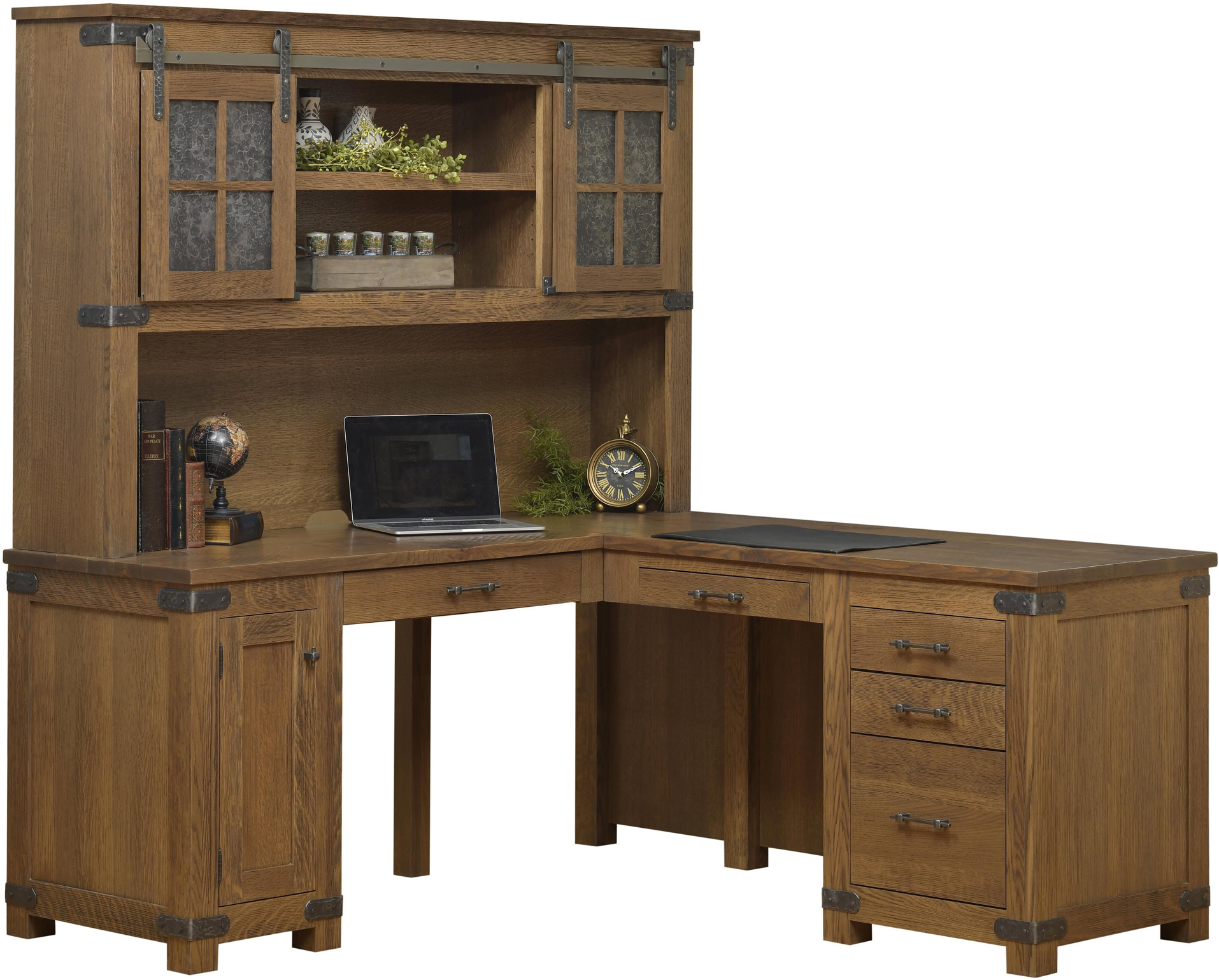 The Georgetown Corner Desk and Hutch brings a classic vibe with a rustic feel to your home office. Check out the sliding ‘barn-style’ doors. Metal accents. Also the antique glass doors with mullions. We’re showing the desk with the optional planked, wire brushed top. Amish cabinetmakers build each unit. Also, they use top hardwoods. Like oak, cherry and maple. No wonder the Georgetown Corner Desk Hutch is so incredibly sturdy. Beautiful. And heirloom-quality. Ready to order? Click the “Customize this product” button below. Then, complete the “Customize Product” fields. Also click the “Get your customized quote” button. Or call 877-357-2106.
