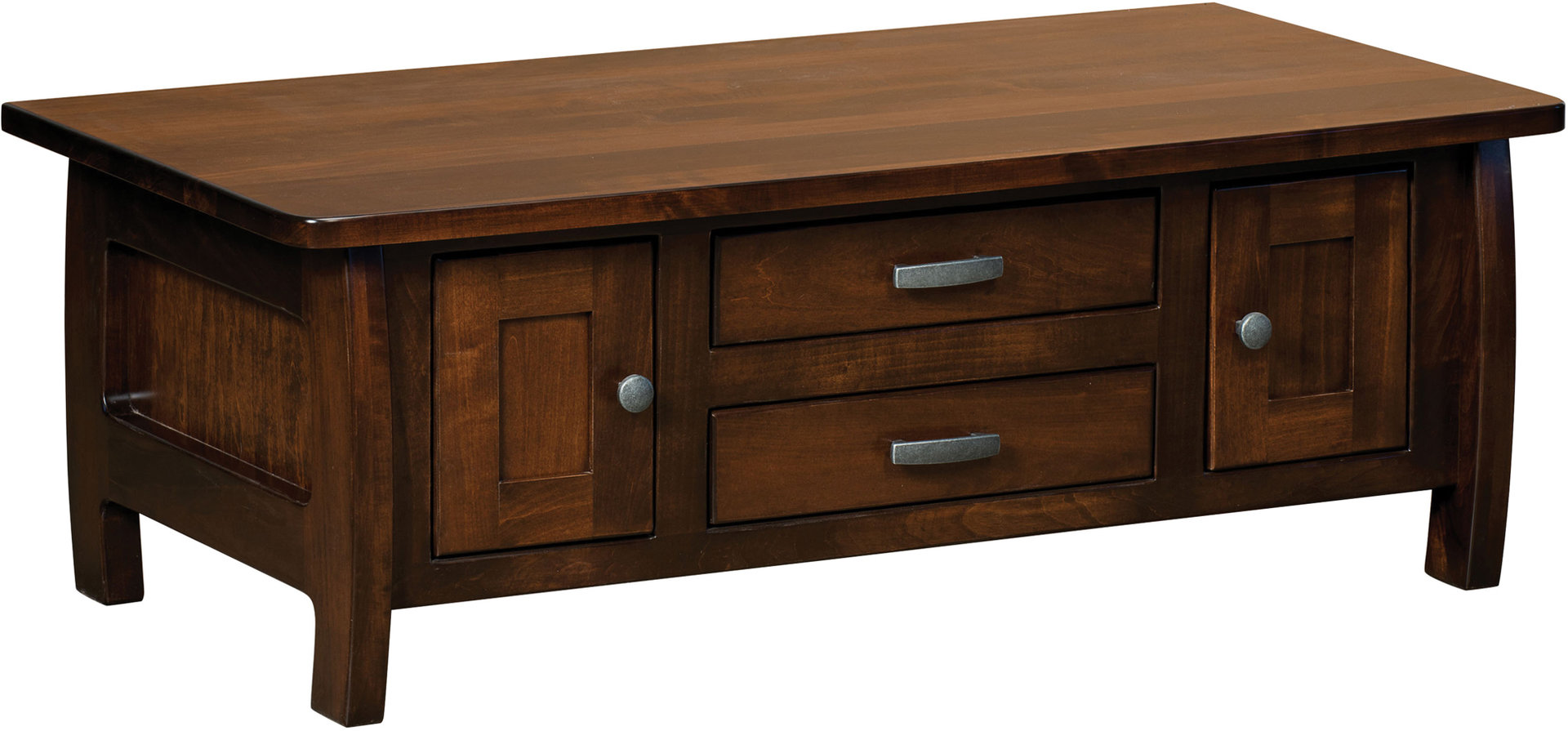 The Grand Teton Cabinet Coffee Table delights the eye with its bowed profile, and reversed raised panel doors and sides. Plus the brushed hardware. Also, the drawers open full extension. So you’ll enjoy easy access to everything inside. Including items at the back. Plus, the doors close with a gentle push. And the 1-inch-thick, solid hardwood top exemplifies the quality of the piece. Amish cabinetmakers – the best in the Midwest – handcraft each Grand Teton Cabinet Coffee Table. Also, they use top hardwoods. Like oak and brown maple (shown with OCS-228 Rich Tobacco Stain). So the coffee table is heirloom-quality! To order, click the “Customize this product” button below. Then, complete the customization fields. Or call 877-357-2106.