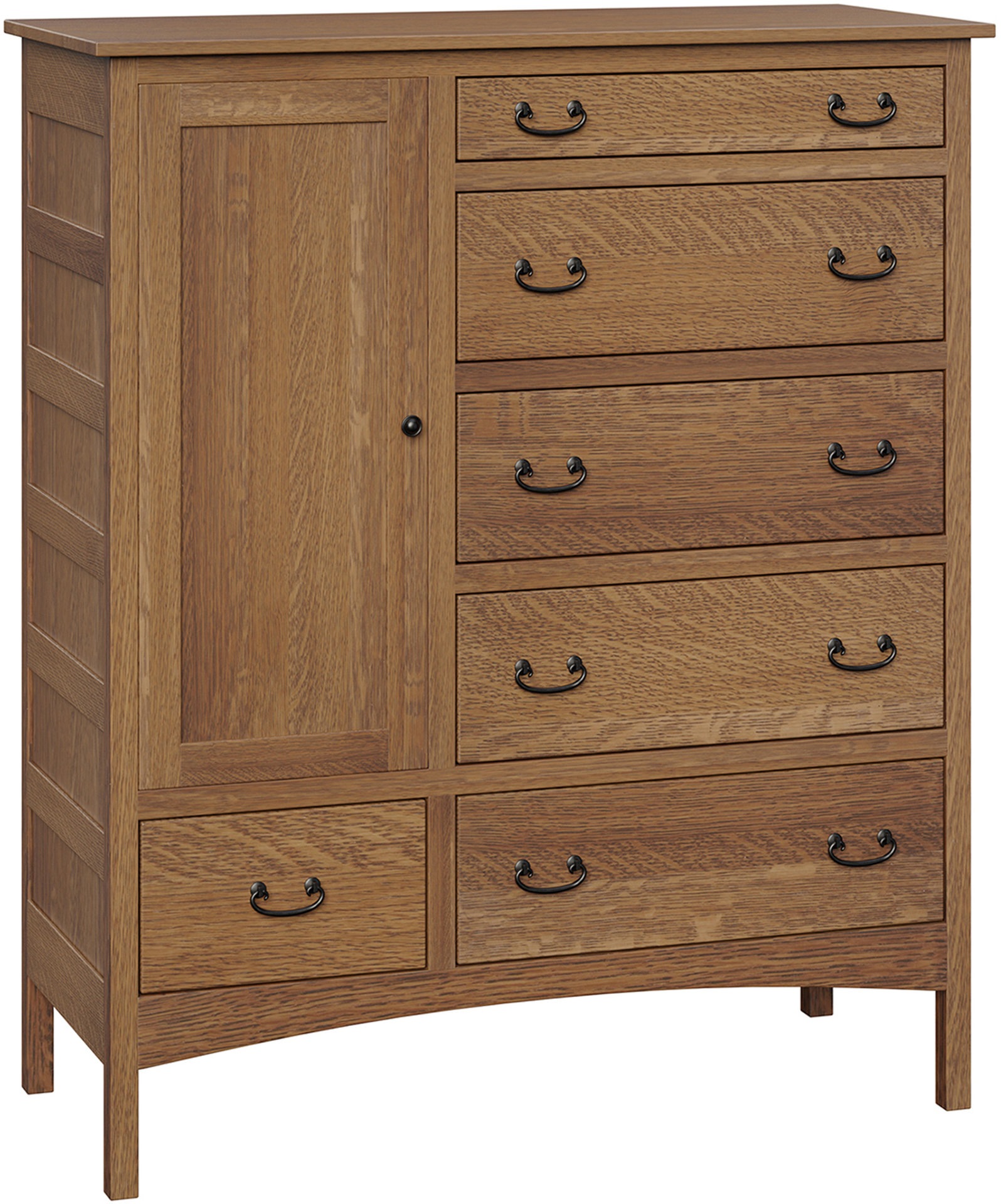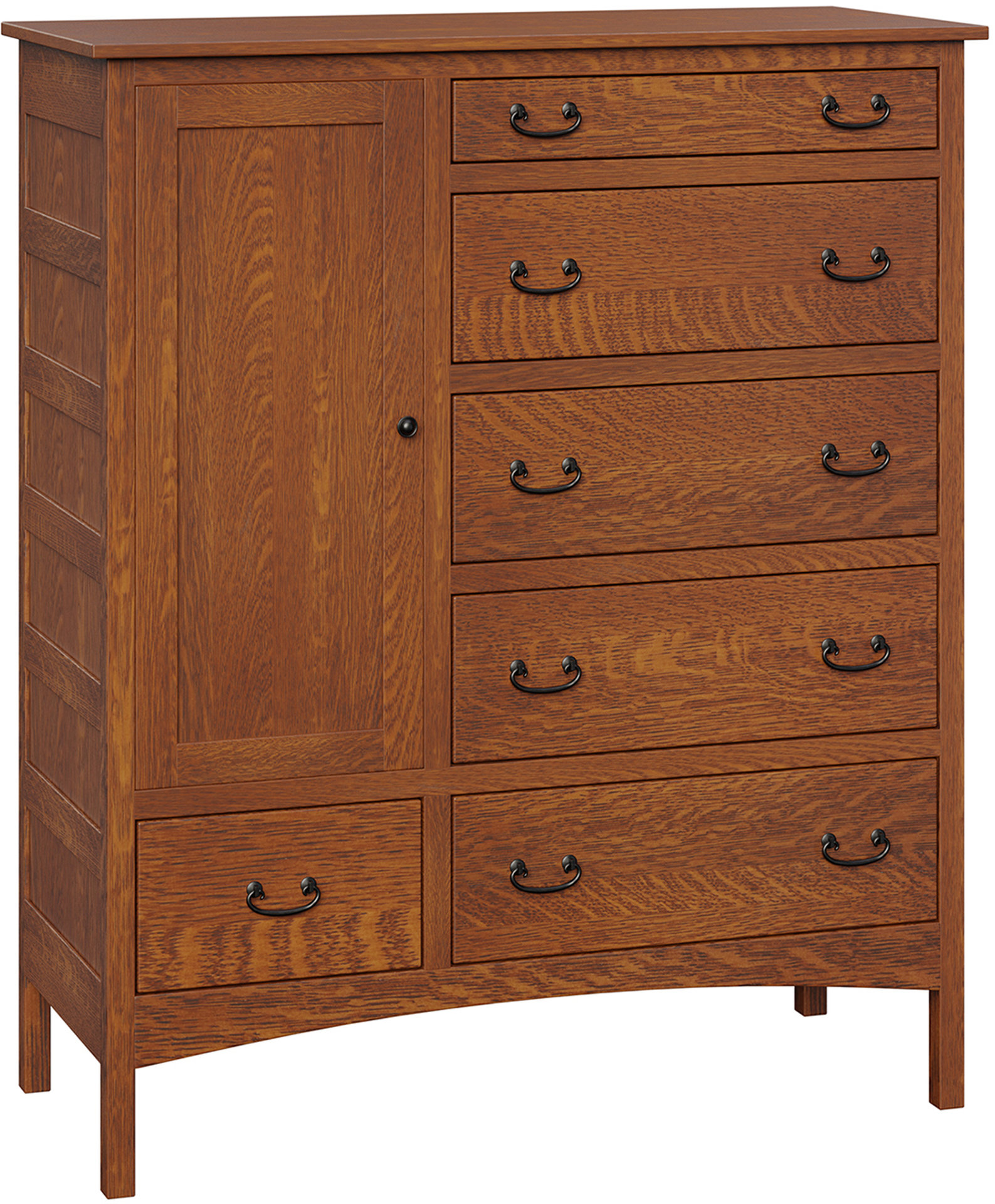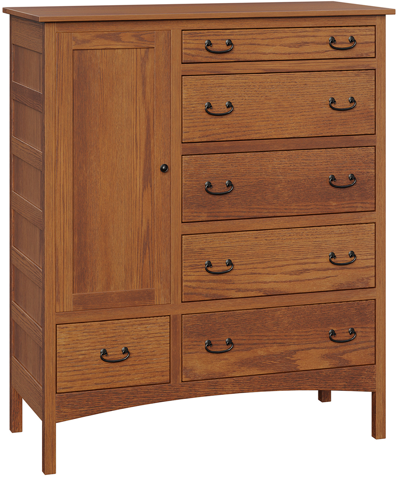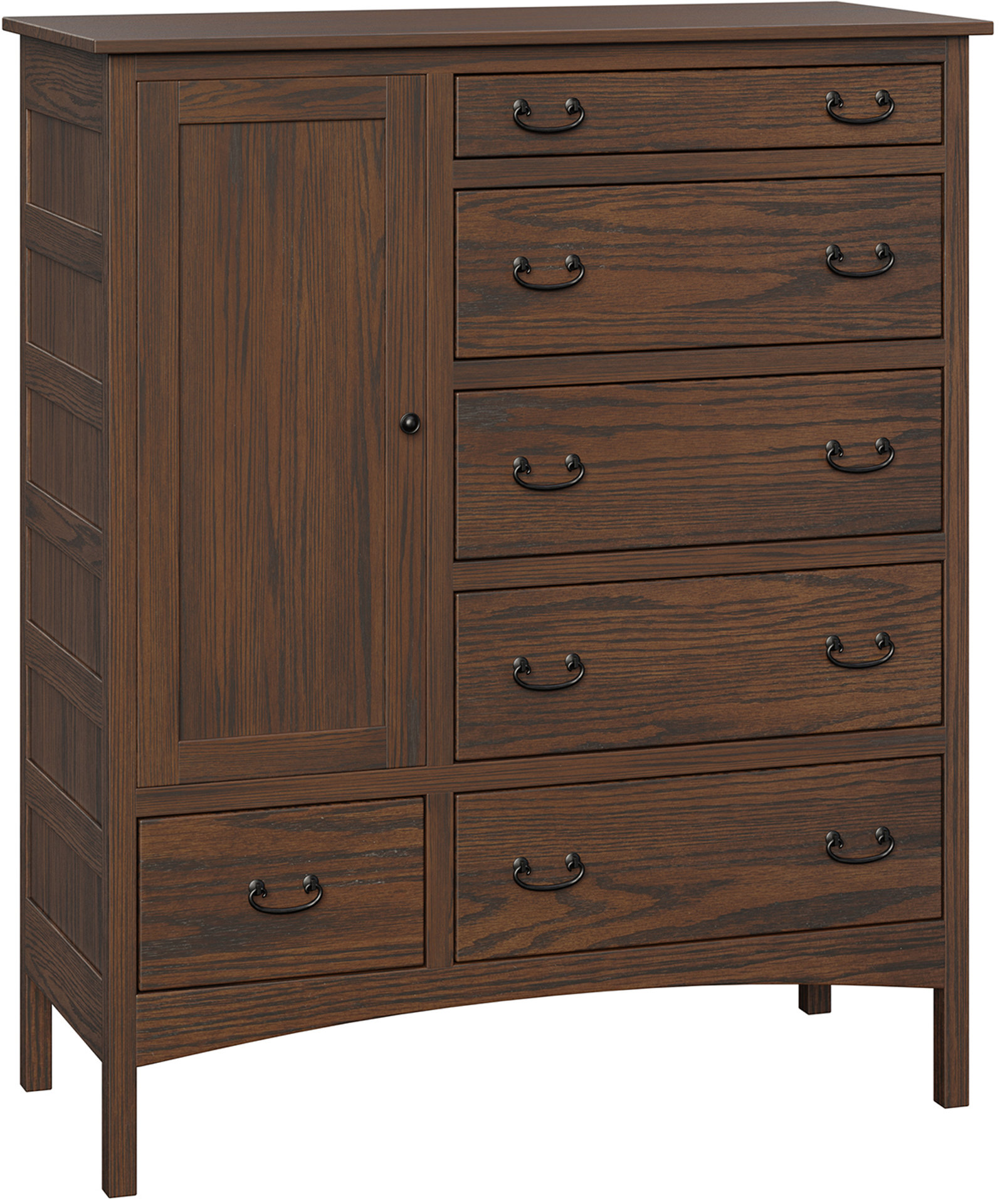 The Granny Mission Single Door Chest is a superb solution to storing clothing items in your bedroom. We place two shelves and a clothing rod behind the door. So you’re able to store clothing items hung up or flat. Also, the drawers open full extension. This means easy access to everything inside. Even items at the back. While the dovetail drawer joints excel in strength. What’s more, the chest is Mission style. So it should blend with your existing furniture. Amish cabinetmakers — the best in the Midwest — build each Granny Mission Single Door Chest. Also, they use top hardwoods. Like oak and cherry. So the chest is beautiful. Sturdy. And heirloom-quality! To order, click the “Customize this product” button below. Then, complete the customization fields. Or call 877-357-2106.