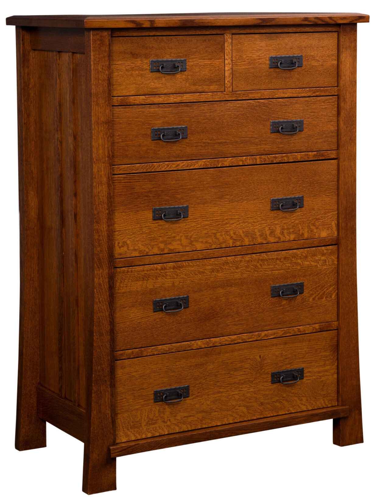From the hefty solid hardwood top to the flared feet, the Grant Style 6 Drawer Chest delights the eye with its stately persona. You can credit the great looks to Mission elements – like clean lines, flush drawers and black Mission pull hardware. So, the chest is ideal for any trendy bedroom. The drawers open full-extension. This means easy access to everything inside. Even items at the back. What’s more, the drawers close with a gentle push. While the dovetail joints enhance strength. Amish cabinetmakers are the best in the Midwest. And they handcraft the unit. Also, they use top regional hardwoods. Like maple, cherry and quarter-sawn white oak (shown with Asbury brown stain). No wonder this chest is so great-looking, sturdy and heirloom-quality! Ready to order? Click the “Customize this product” button below. Then, complete the customization fields. Or call 877-357-2106.