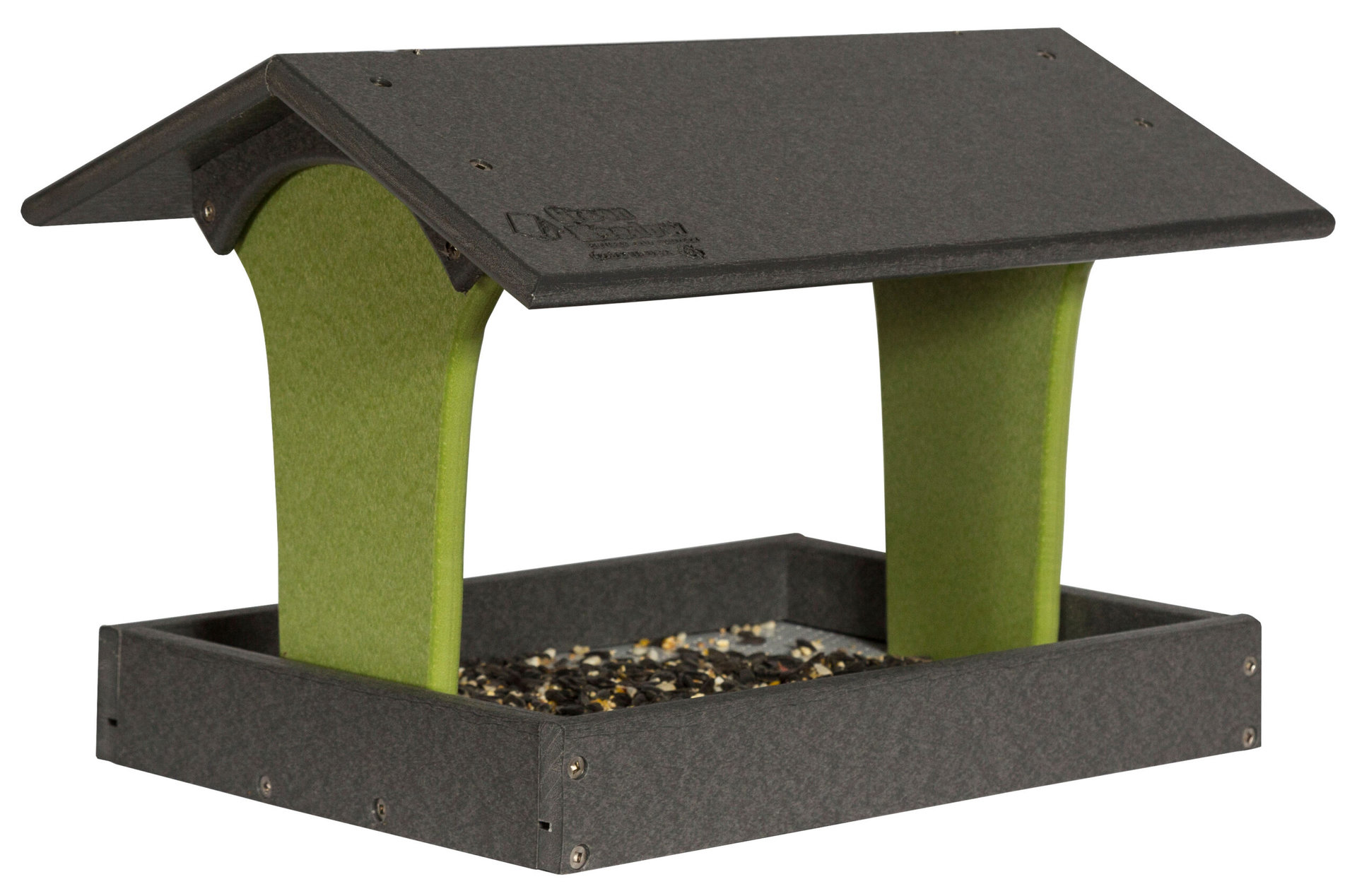 Hung from rafters or mounted on a post, the Hanging Fly-By-Feeder is the ideal way to attract birds to your yard. At 15 inches by 10 inches, the feeder is large enough to accommodate lots of feathered friends. An aluminum screen at the bottom of the deep tray provides a sturdy floor. Amish artisans build the feeder from 100% post-consumer recycled plastic. So, it’s durable and termite-resistant. Also, we use stainless screws. So the feeder is largely maintenance-free. Ready to order? Click the “Customize this product” button below. Then, fill out the open (blank) fields. Or call 877-357-2106.