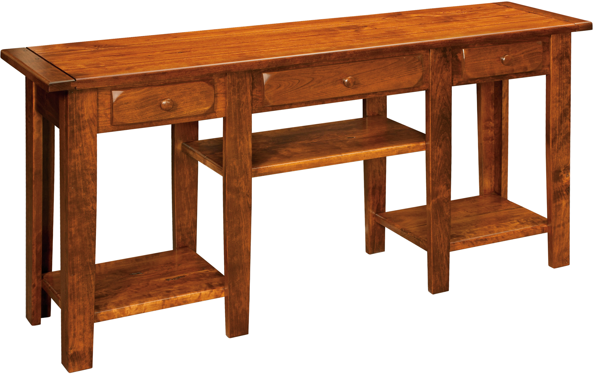 The Homestead Deluxe Rustic Sofa Table combines rustic and trendy elements. Plus an innovative split-height shelf design. Now, imagine the table all decked out with your decorative items! On the top plus the three shelves! You’ll find knots and wormholes in the rustic cherry wood. Also, our Amish cabinetmakers hew the tabletop from 1-inch-thick wood planks. And, they include breadboard ends. Plus solid wood knob hardware. What’s more, the drawers of the Homestead Deluxe Rustic Sofa Table open full extension. So you’ll enjoy easy access to everything. Even items at the back. While the dovetail drawer joints excel in strength. Our Amish builders are the best in the Midwest. Also, they build with hardwoods. So the table is sturdy. Durable. Also heirloom-quality! To order, click the “Customize this product” button below. Then, complete the customization fields. Or call 877-357-2106.