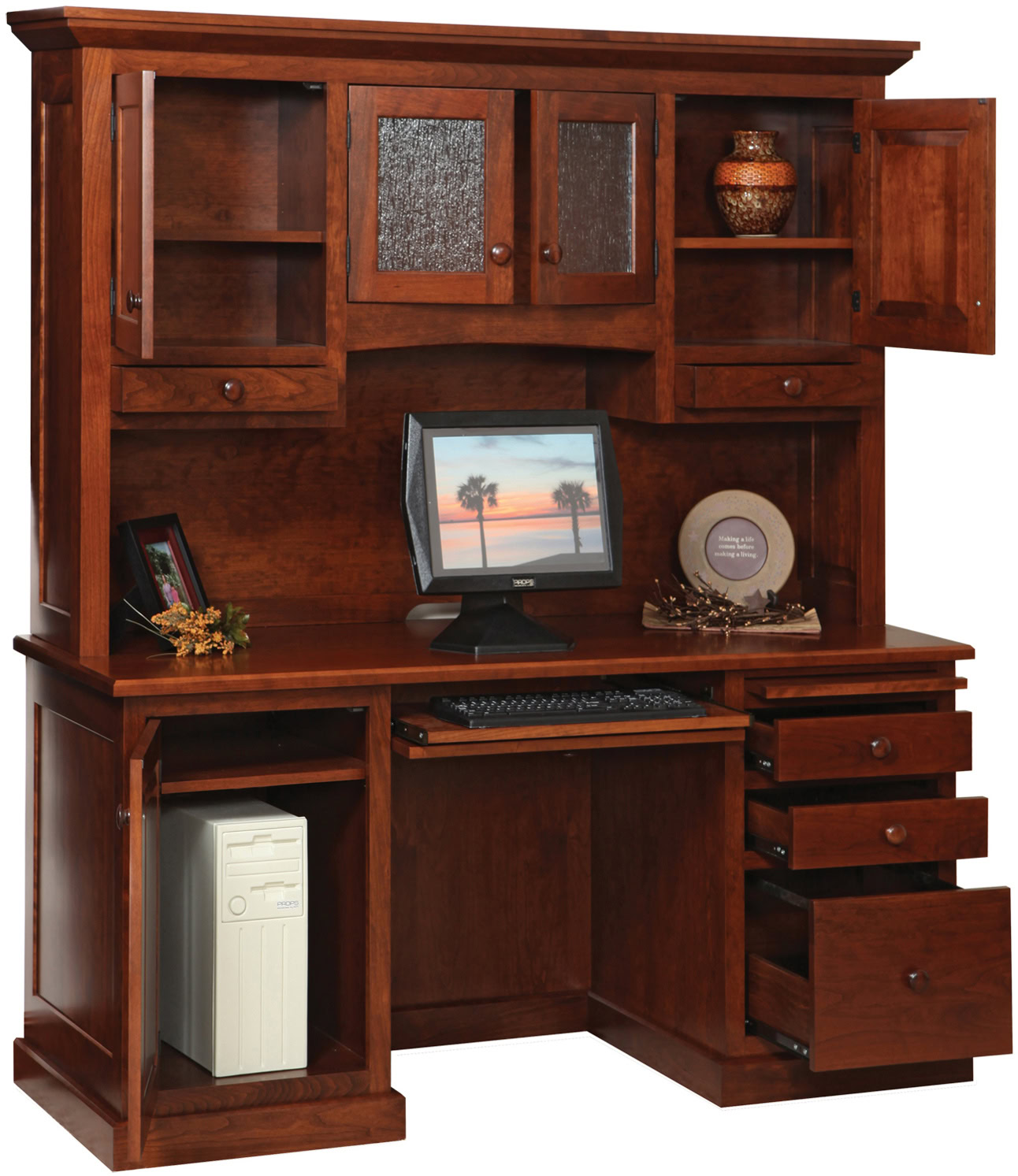 The Homestead Office Collection has all the elements you need to set up the ideal home office. Yet, this collection is far superior to office furniture normally found in office furniture stores and big-box stores. Because Amish cabinetmakers build each item in the set. Also, they use top hardwoods. Like oak, maple and cherry. So you will not find particle board. Veneered cardboard. Or any other bargain substitutes. The result? The Homestead Office Collection is sturdy. Durable. Also heirloom-quality. Ready to order? Click the “Customize this product” button below. Then, complete the “Customize Product” fields. Also click the “Get your customized quote” button. Or call 877-357-2106.