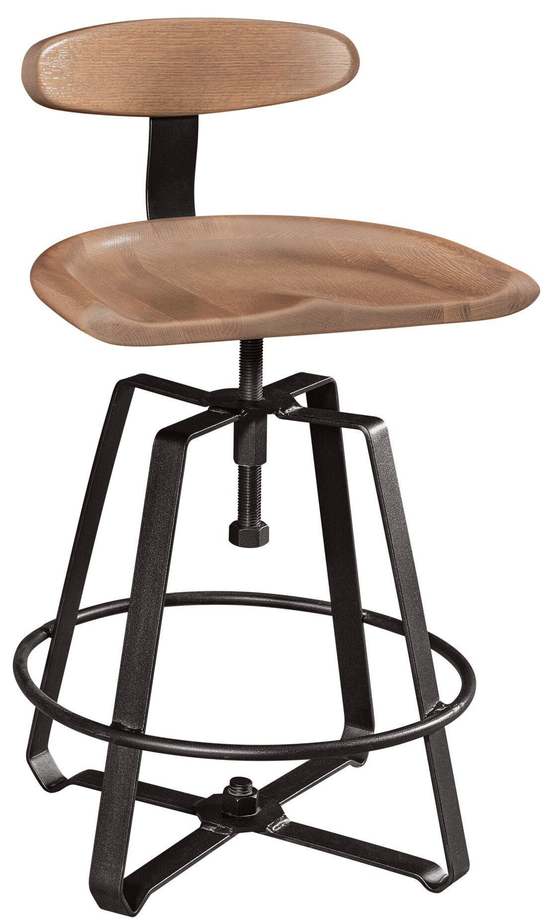 The Iron Craft Adjustable Barstool is available as shown or unfinished. Or, we’ll build it to meet your needs or desires. Your choices for wood include cherry, maple, hickory, elm and oak. The unit shown is rustic quarter-sawn white oak with Michael’s Cherry Stain.
