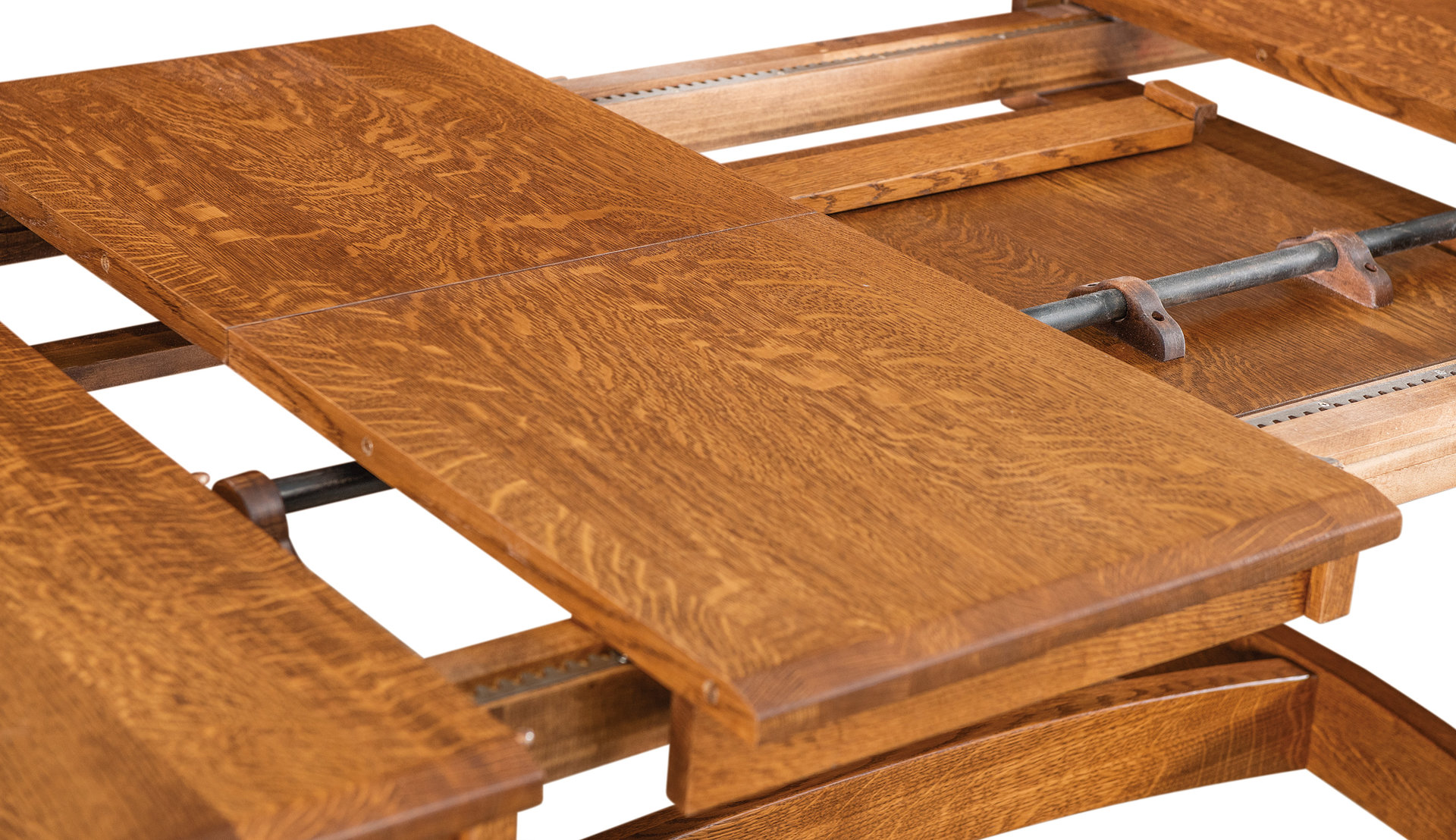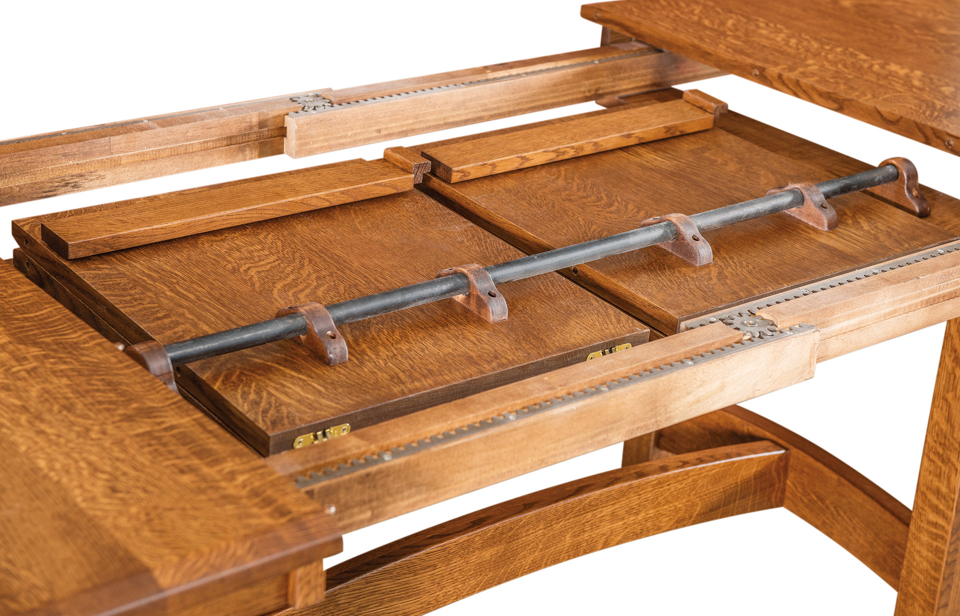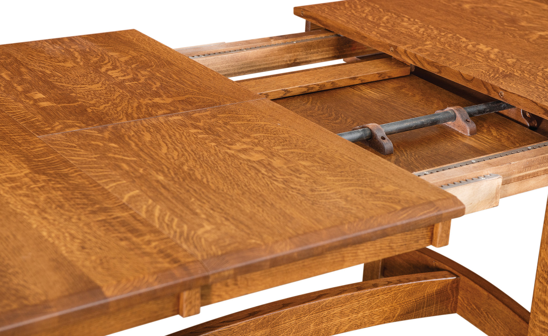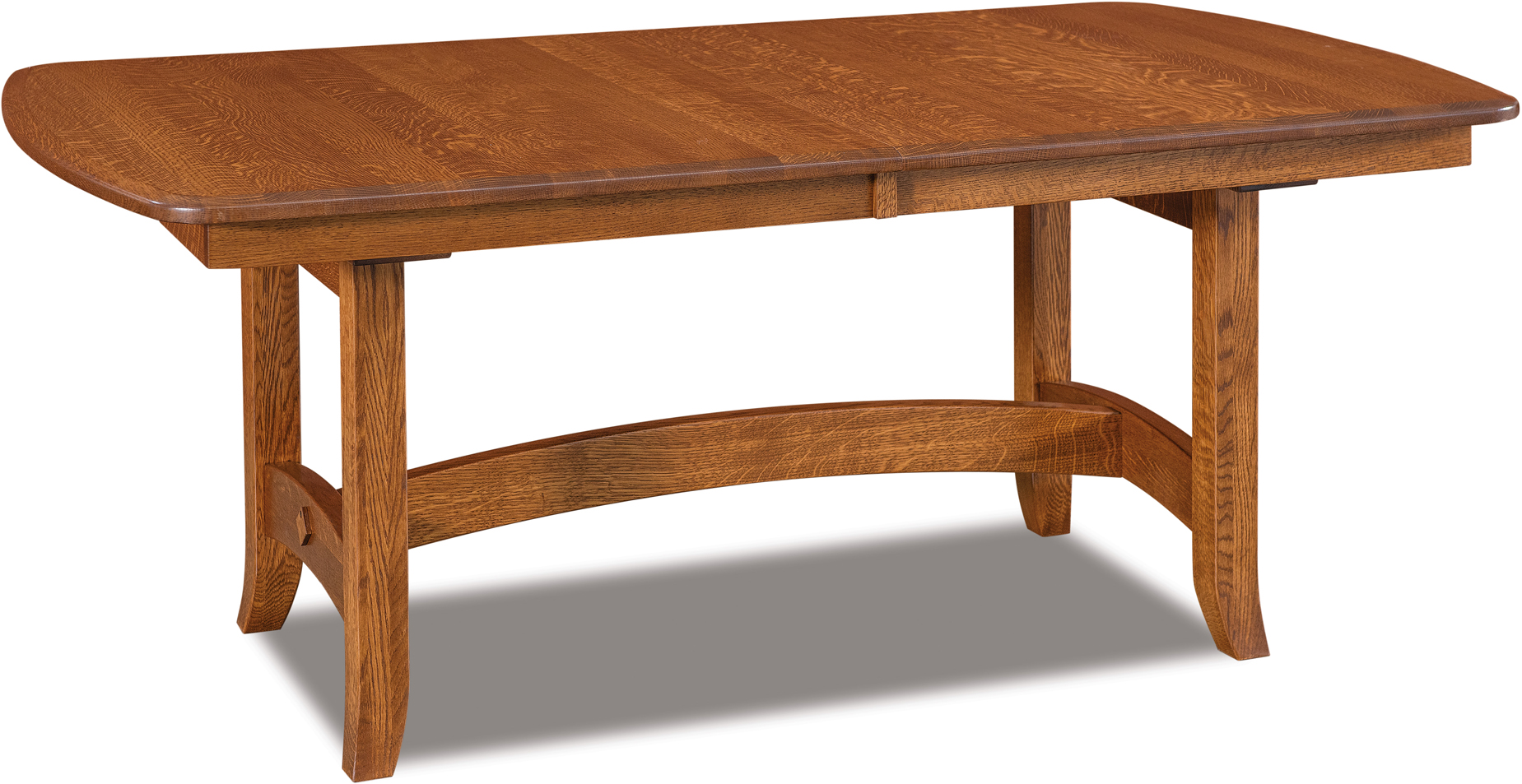 With its eye-catching trestles, curved cross-member, and bow tabletop end, the Iva Trestle Table will add distinction to your dining room. We offer the table in widths of 42 and 48 inches and lengths of 60, 66, and 72 inches. So you can choose the table size that best meets your needs and desires. Ready to extend the table? Pull on one end. And the tabletop opens up – thanks to the butterfly system. Then, the leaves slide into place. Yet, the trestles do not move. Also, up to four leaves can self-store below the 1-inch-thick solid hardwood top. Amish cabinetmakers – the best in the Midwest – handcraft each Iva Trestle Table. Also, they use top hardwoods like maple, cherry, and quarter-sawn white oak (shown with Asbury stain). So the table is heirloom-quality! To order, click the “Customize this product” button below. Then, complete the customization fields. Or call 877-357-2106.
