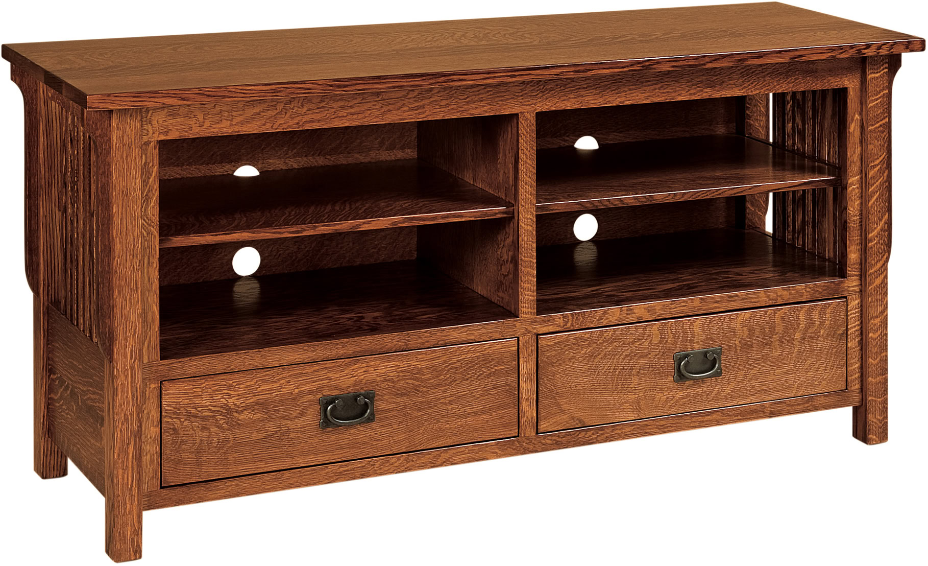 The Landmark Wide Open TV Cabinet boasts beautiful Amish craftsmanship. Its four open compartments provide room for all of your media components. The two drawers also provide hidden storage for all your CDs and DVDs. Cord holes in the rear of the TV Stand help you keep your devices organized and cords managed, so you can keep your entertainment area tidy. Wood slat sides and corbels on each corner add a unique look to the traditional Mission style.