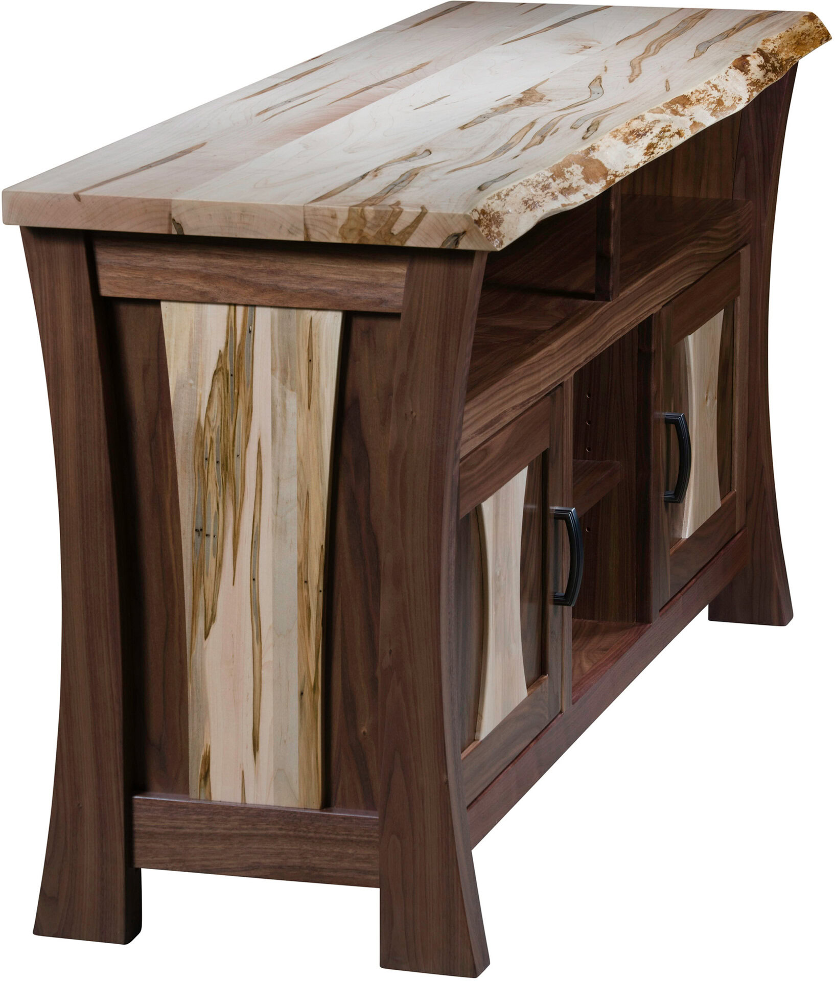 The Legacy Live Edge TV Stand has a live edge top that adds great beauty and style to it. Without a doubt it is a conversation piece. You may want to order it as you see it here with natural walnut and natural wormy maple top, shelves and side inserts. Then, it will become a showstopper. So, if you are looking for something different that will set you apart from all of your friends then this is the TV stand for you.