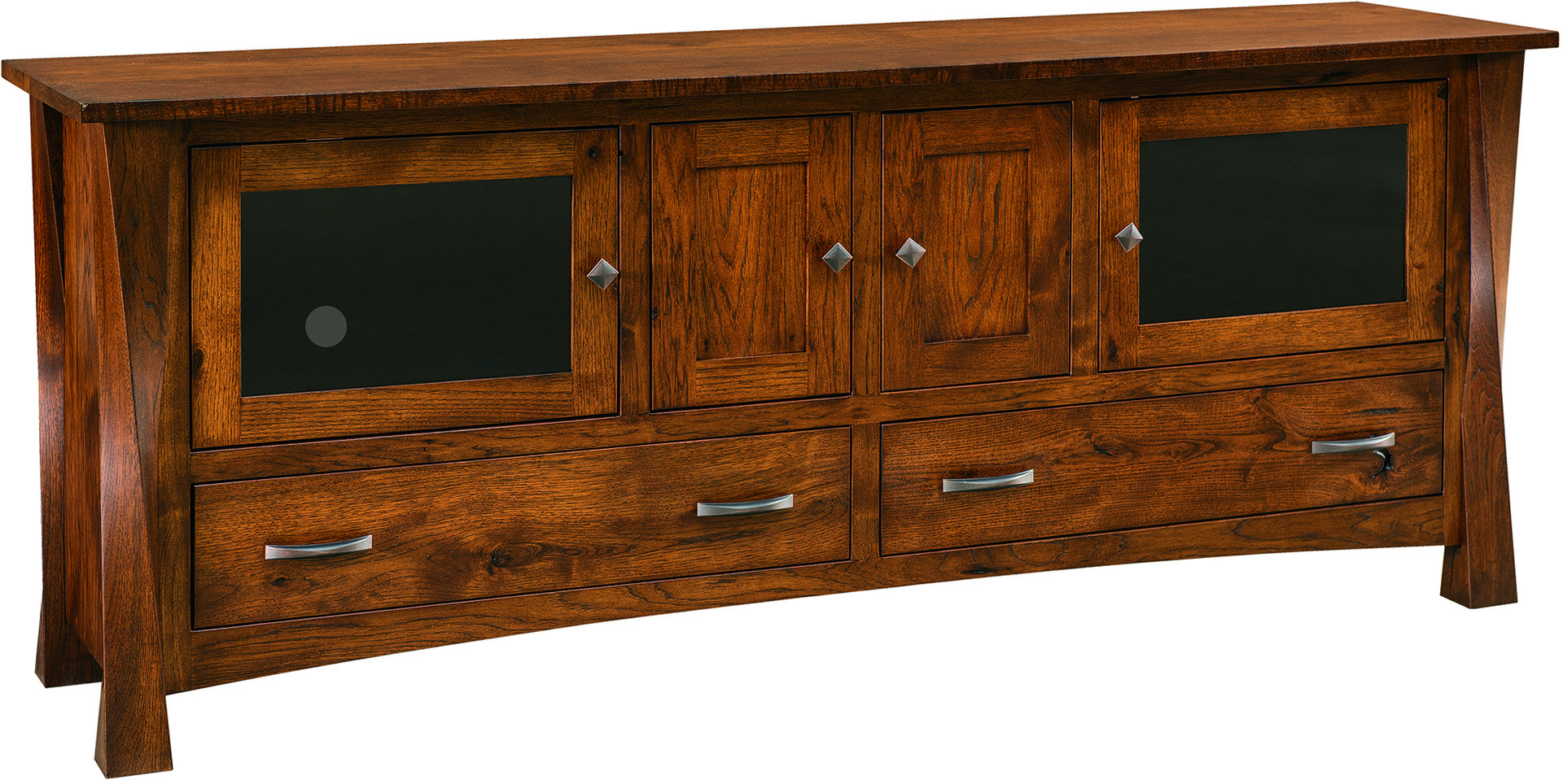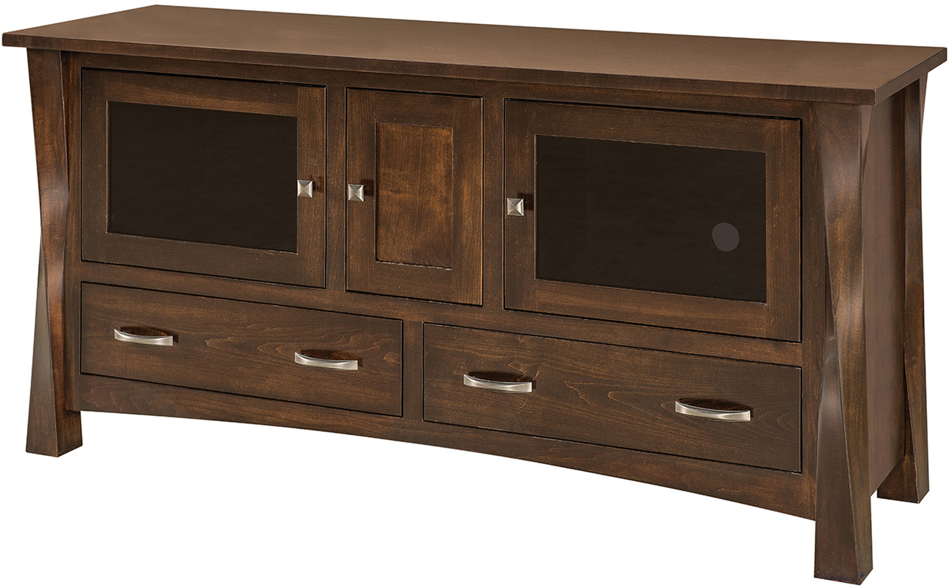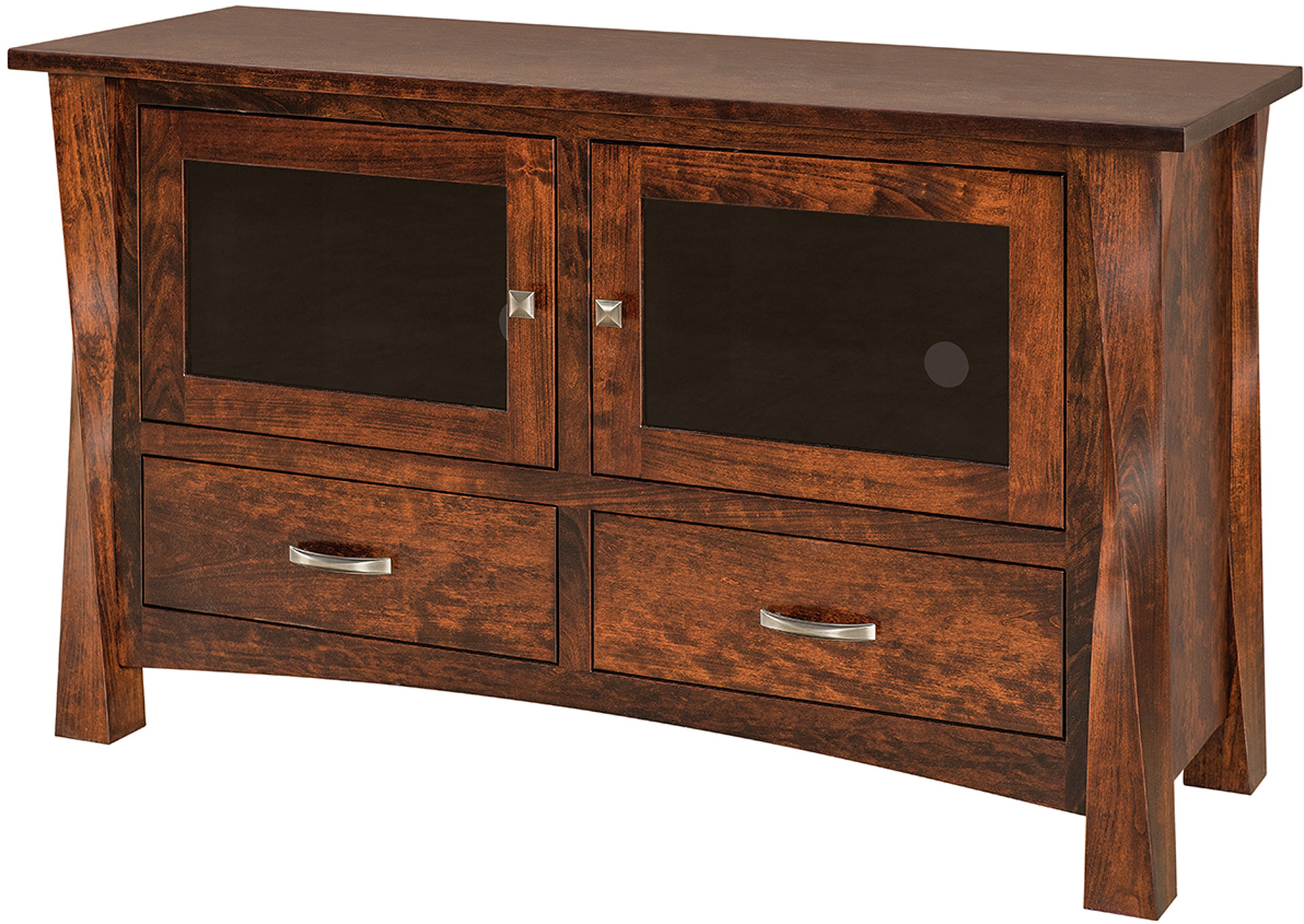 Superb cabinetmaking, great design and practical features stand out in the Lexington Plasma TV Stand. Our Amish craftsmen carve the square corner posts to look twisted. Very cool! Also, the smoked glass doors, flush drawer fronts and matching hardware certainly turn heads!