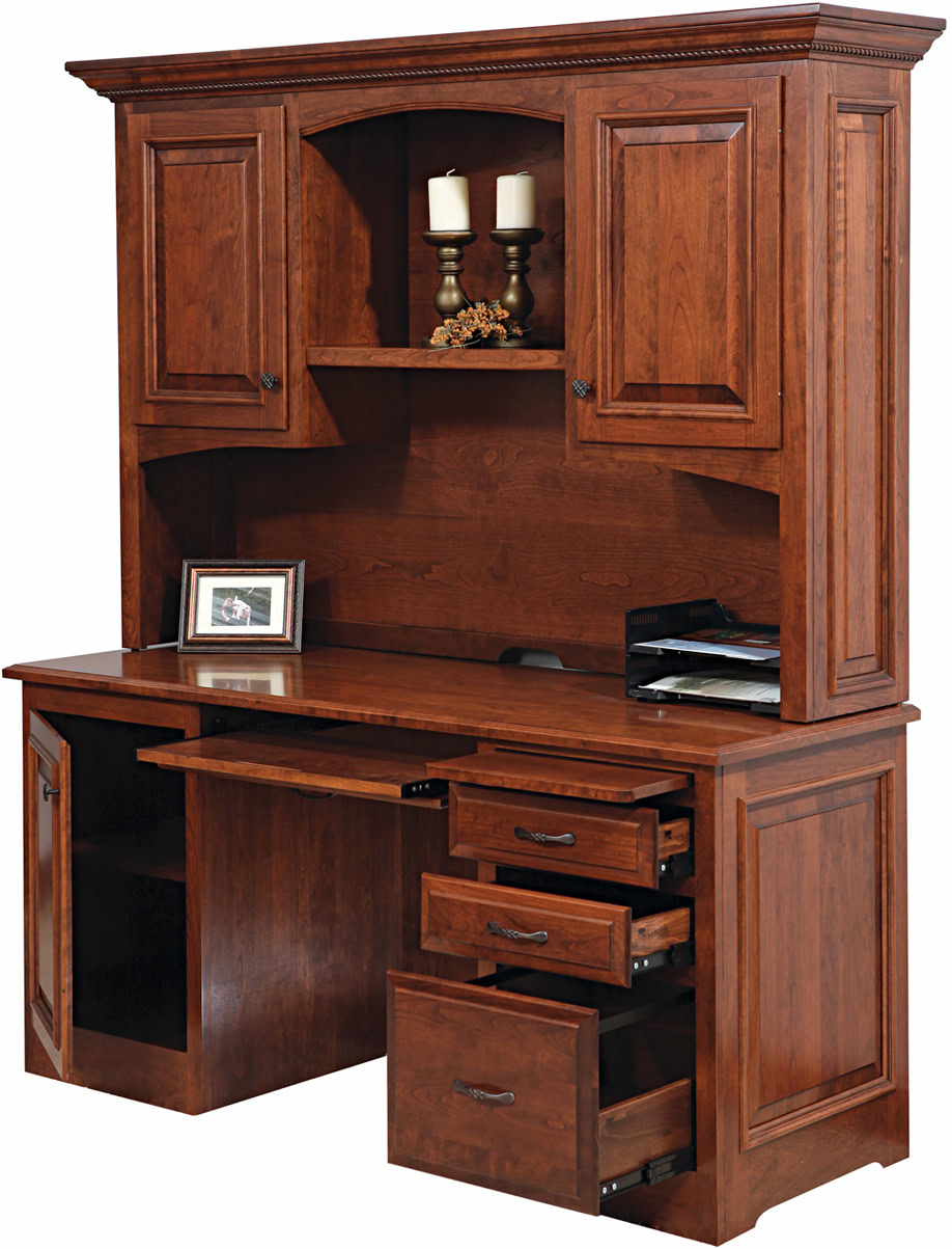 With its rope trim detail in the crown molding, raised panels and rich, solid hardwood construction, the Liberty Office Collection communicates a feel of distinction. In fact, it’s far superior to office furniture normally found in office furniture stores and big box stores. Because Amish cabinetmakers custom-build the set. Also, our builders use top hardwoods. Like oak, cherry and maple. No wonder the Liberty Office Collection is so sturdy! Durable. And heirloom-quality. Ready to order? Click the “Customize this product” button below. Then, complete the “Customize Product” fields. Also click the “Get your customized quote” button. Or call 877-357-2106.