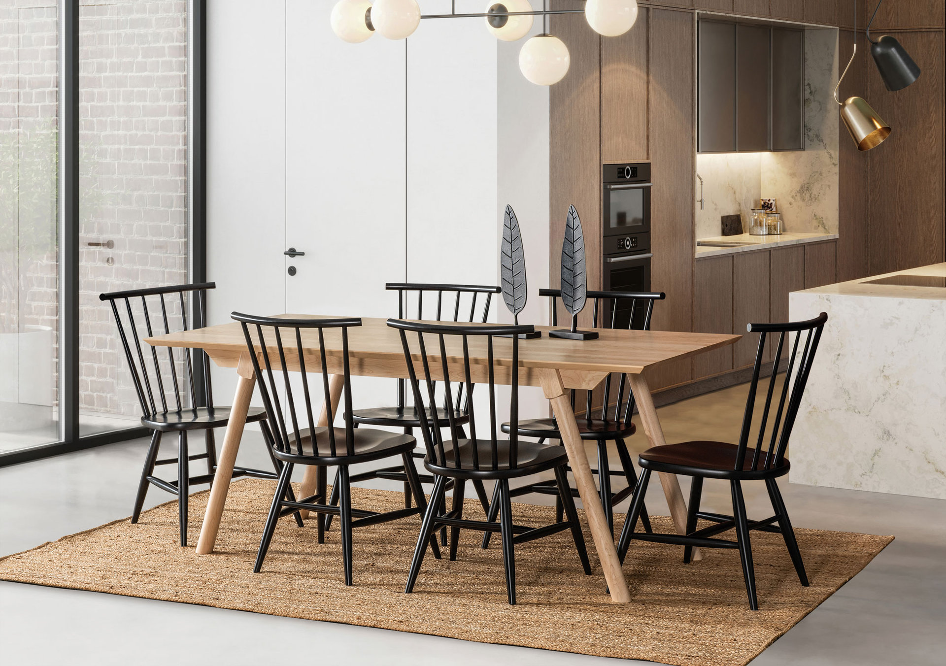 You’ve found a trendy centerpiece for your modern dining room: the Linwood Style Leg Table Set. With its rectangular top, splayed legs and 2 ½-inch skirt, the table gives a trendy vibe. While the chairs – with their ‘turned-post’ spindles and steam-bent backrest crown – enhance the look. We offer the table in several sizes. So, you can find the size that best meets your needs and desires. Amish cabinetmakers – the best in the Midwest – build the set. And they use top hardwoods like oak, cherry and walnut. No wonder the table and chairs are so attractive, sturdy and heirloom-quality! Ready to order? Click the “Customize this product” button below. Then, fill out the customizing fields. Or call 877-357-2106.
