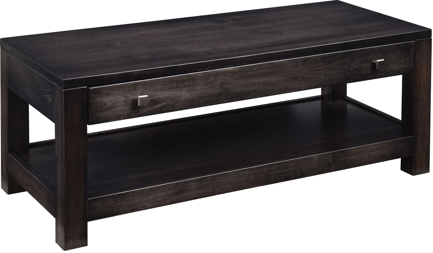 Presenting the perfect coffee table for your trendy, upscale living room: the London Style Coffee Table. Notice the clean lines, flush drawer and square, brushed chrome hardware. The tabletop, full-width drawer and bottom shelf provide lots of space to stow and display your living room picture books, devices and decorative items. Also, you can complement the coffee table with other London living room pieces. Amish cabinetmakers — the best in the Midwest — build the table from top hardwoods like oak, cherry and brown maple (shown with FC-19093 Dark Knight stain). No wonder this piece is heirloom-quality! In fact, it’s far superior to bargain tables built with wood substitutes like medium-density fiberboard (MDF) and particle board. Ready to order? Click the “Customize this product” button below. Then, fill out the customization fields. Or call 877-357-2106.