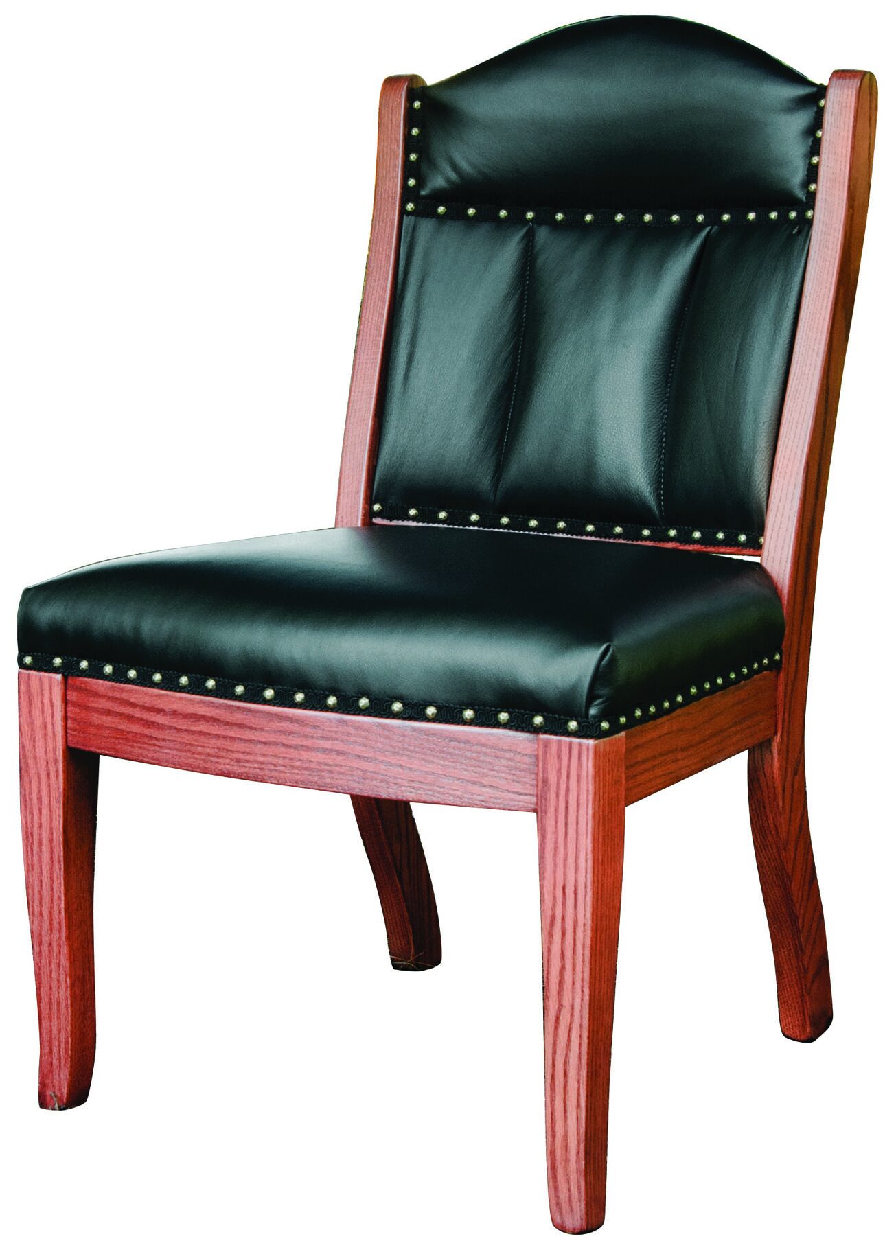 The Low Back Client Side Chair has a padded seat and back. The stationary chair has a padded back that is plush with comfort. The back height has a nice, low profile. Also, nail head trim accents the seat, back, and arms. Pad the chair out of fabric or leather to fit any decor. Customize the solid wood frame with a variety of wood and stain choices.
