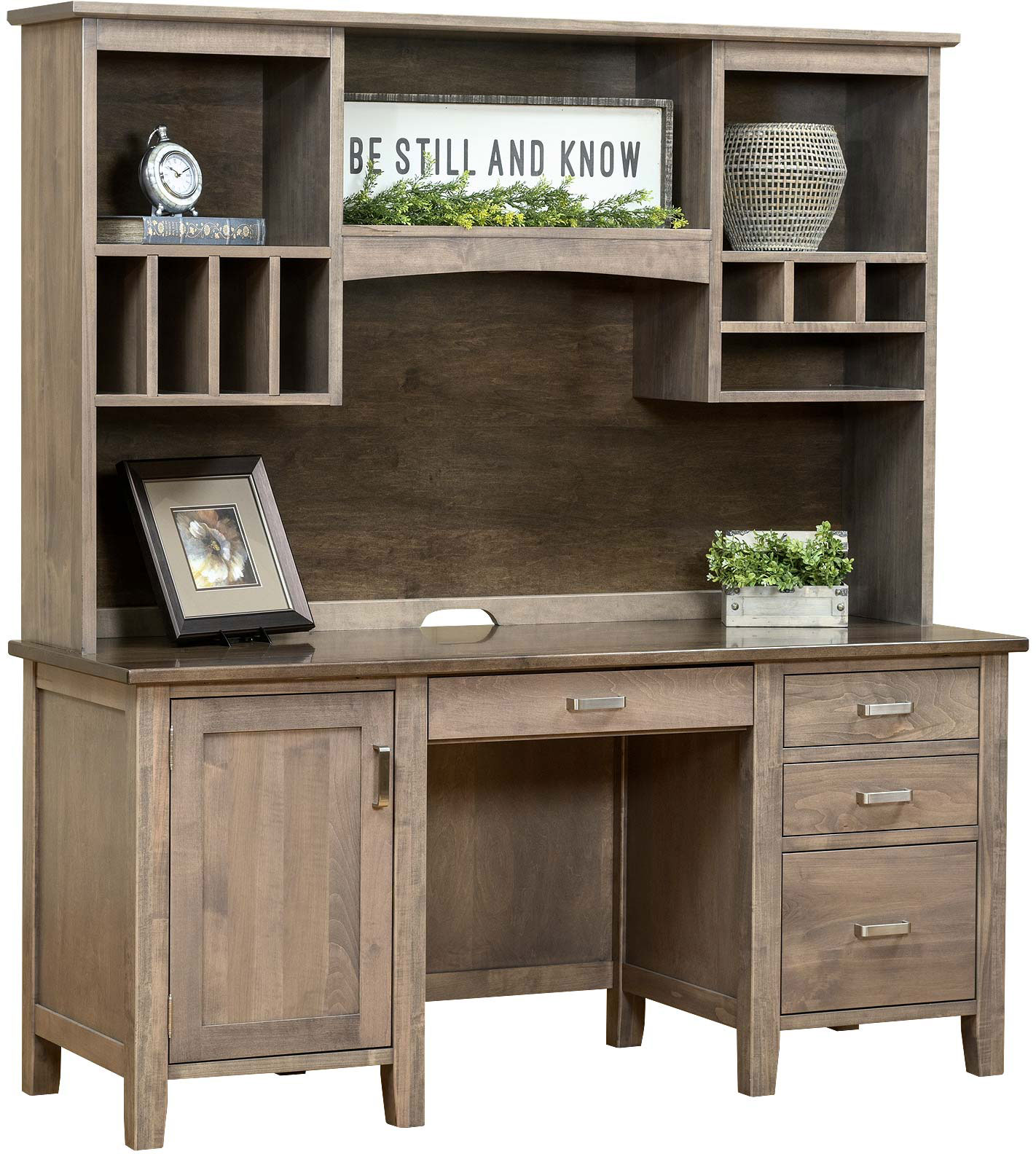With its practical features and great looks, the Manhattan Credenza Base with Hutch works perfectly as a stand-alone work area. Or, you can use it to complement your executive desk – and other pieces of furniture such as a bookcase and file cabinet.