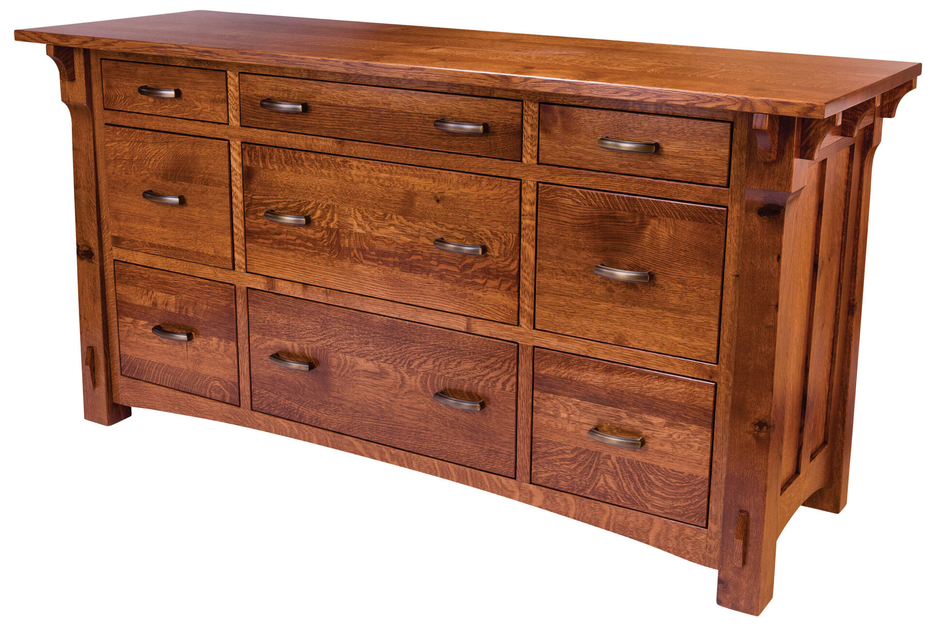 From the decorative corbels just below the hefty, solid wood top to the exposed tenons and arch skirt down below, the Manitoba Credenza delights the eye with its distinctive look. Imagine this fine piece of furniture in your home office! The drawers open full-extension. That’s your assurance of easy access to everything inside. Even items at the back of each drawer. Amish cabinetmakers – the best in the Midwest – build the credenza. And they use top hardwoods, like brown maple (shown with Rich Tobacco stain). No wonder the piece is so sturdy and heirloom-quality! Ready to order? Click the “Customize this product” button below. Then, fill out the customization fields. Or call 877-357-2106.