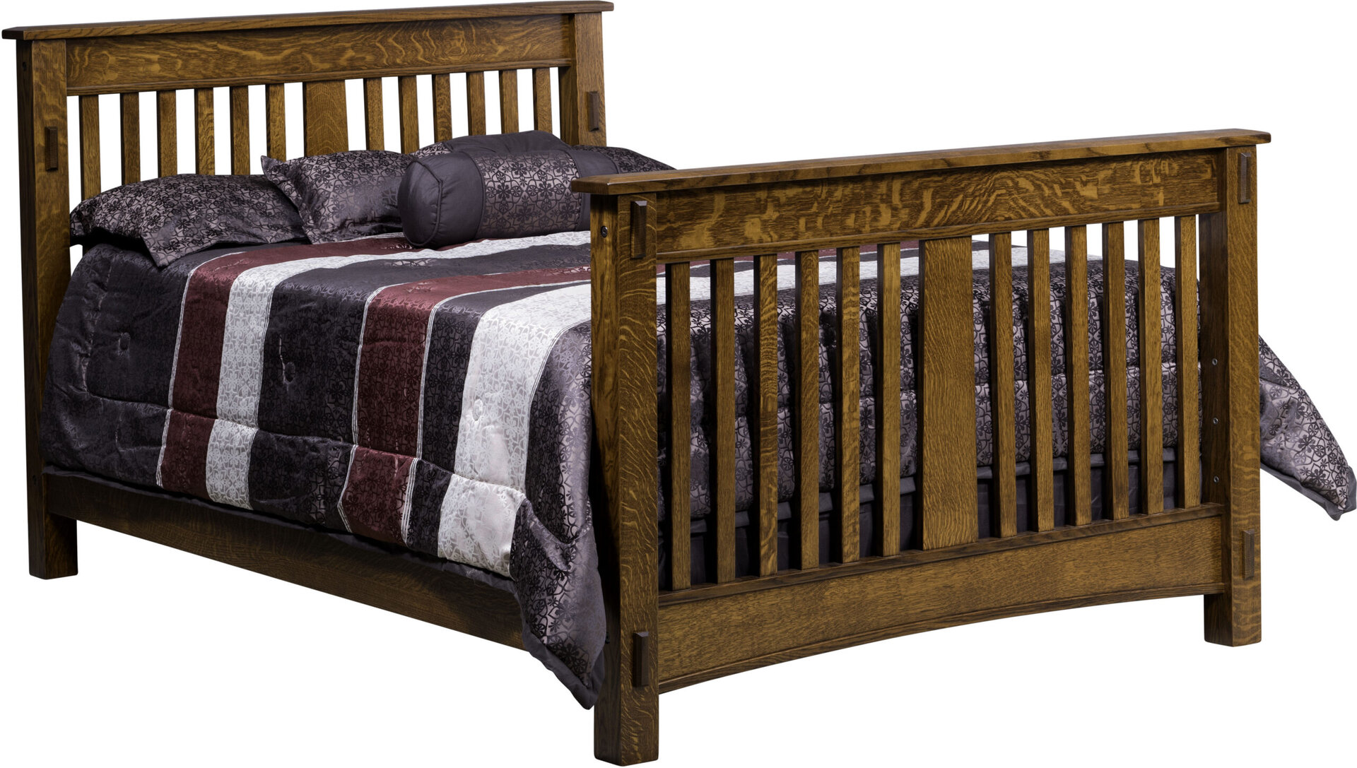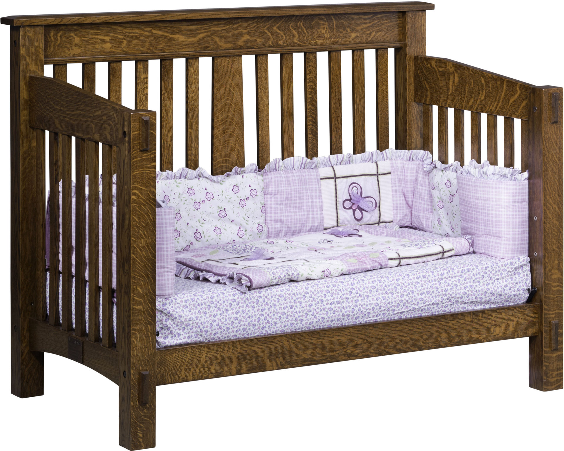 The McCoy Convertible Crib is a beautiful gift that will continue to grow with any child. The crib style features a strong mission design with angled slats. Also, front legs have a tenon accent. The crib has 3 adjustments for the mattress height. The mattress can be lowered as the child grows. In addition to the standard crib, this handcrafted masterpiece can turn into a day bed and eventually a full size bed. Another way the set can grow with the child is with the addition of matching dressers, nightstands, and chests. The quality of this bedroom furniture will last a lifetime.