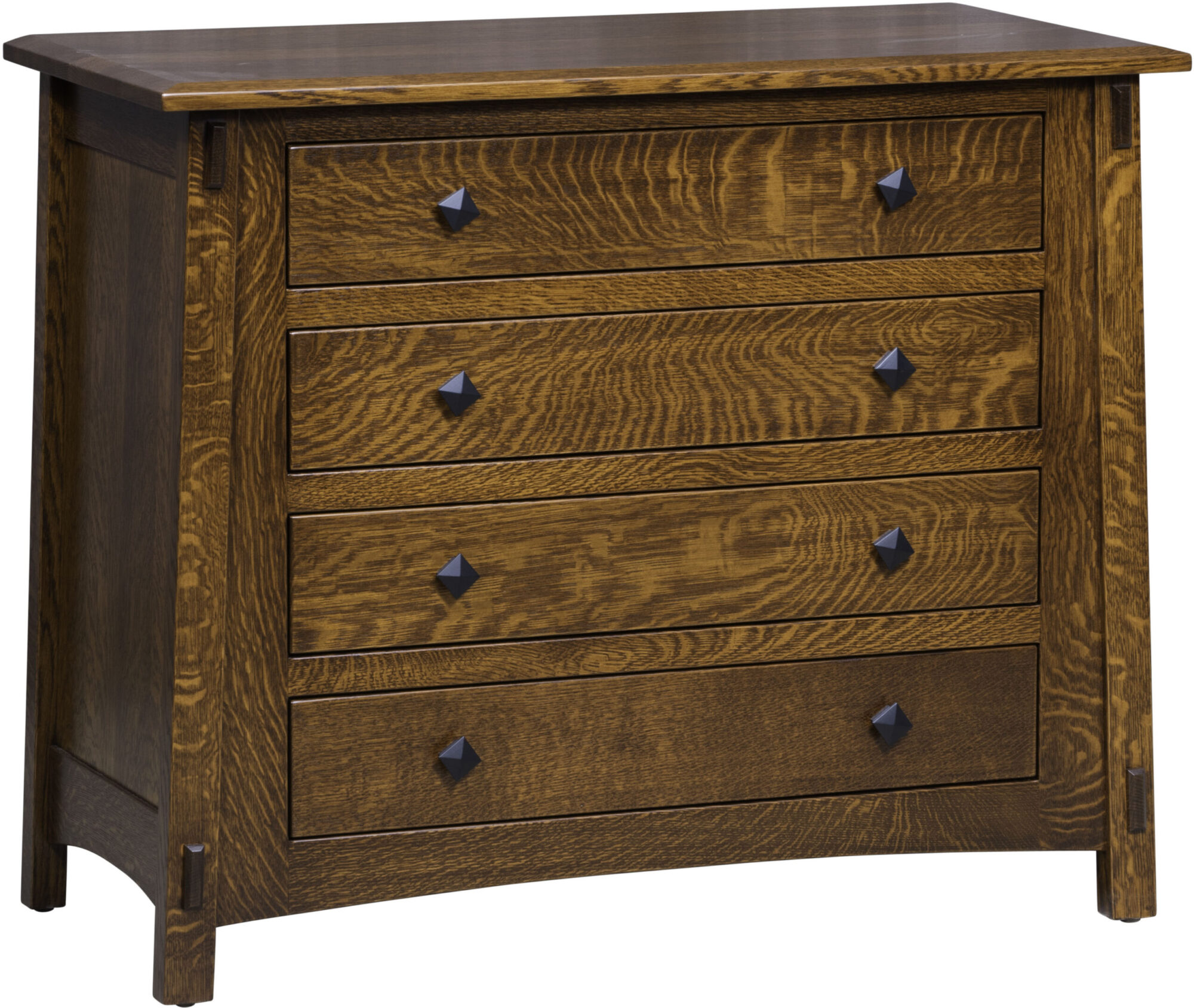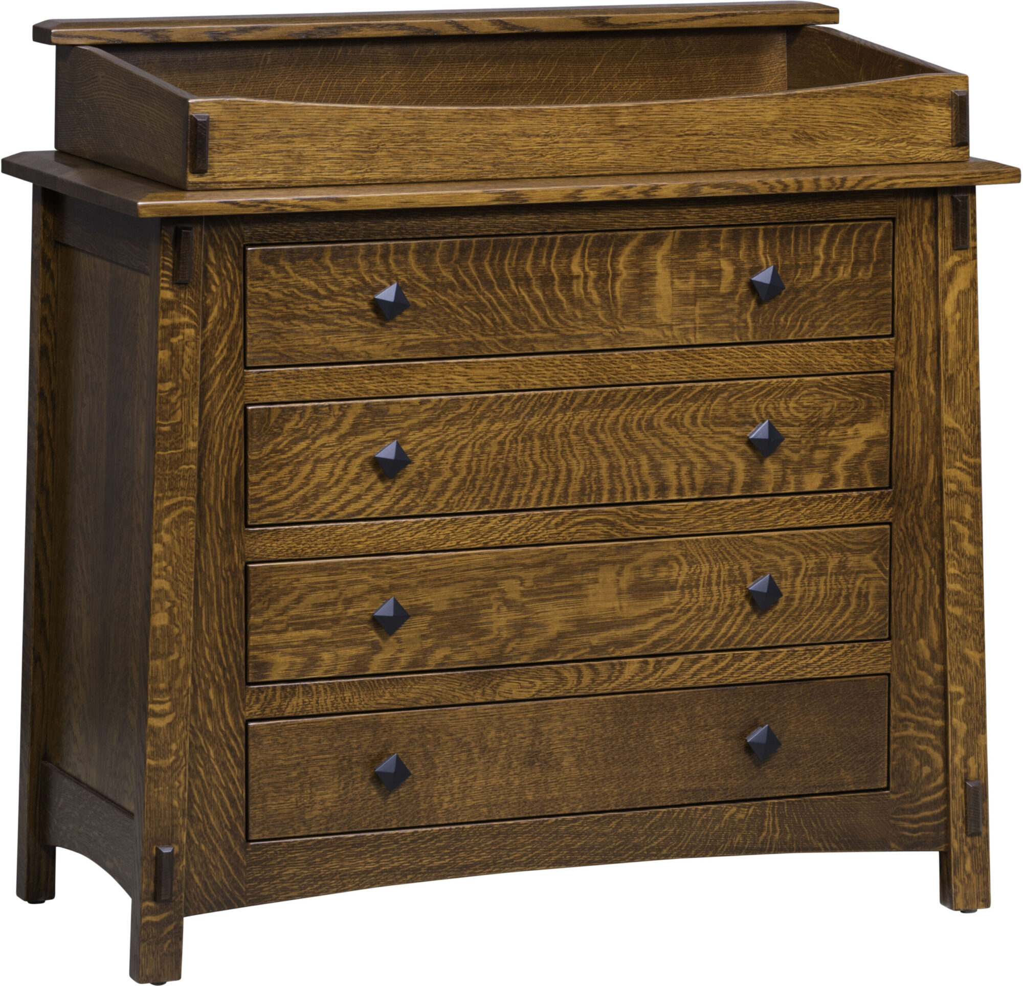 The McCoy Four Drawer Changer Dresser is a mission-style dresser that will grow in age with any child. The dresser style features angled legs and 4 full-extension drawers. Also, a decorative tenon accents each of the legs for that mission charm. Add to the chest by purchasing the matching conversion crib, day bed, and full bed. Other additions for the set would include nightstands, dressers, and mirrors. The quality of this bedroom furniture will last a lifetime.