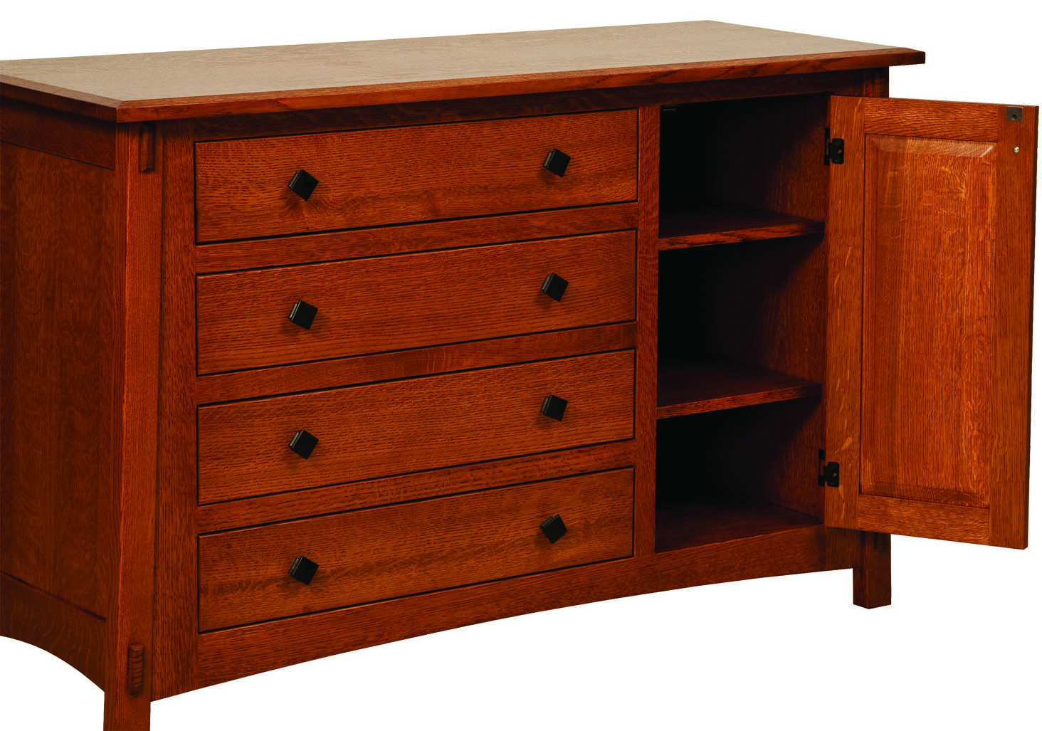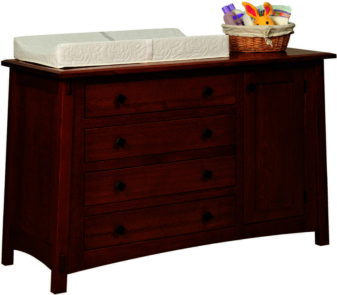 The McCoy Four Drawer-One Door Changer Dresser is a mission style dresser that will grow in age with any child. The dresser style features angled legs and 4 full-extension drawers. Behind the door are 2 adjustable shelves. Also, a decorative tenon accents each of the legs for that mission charm. Add to the dresser by purchasing the matching conversion crib, day bed, and full bed. Other additions for the set would include nightstands, chests, and mirrors. The quality of this bedroom furniture will last a lifetime.