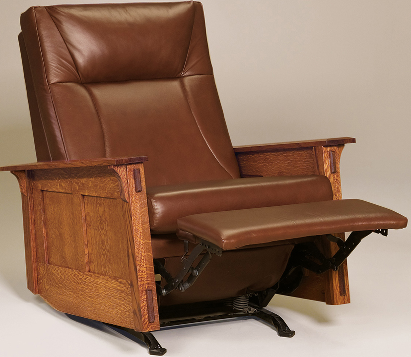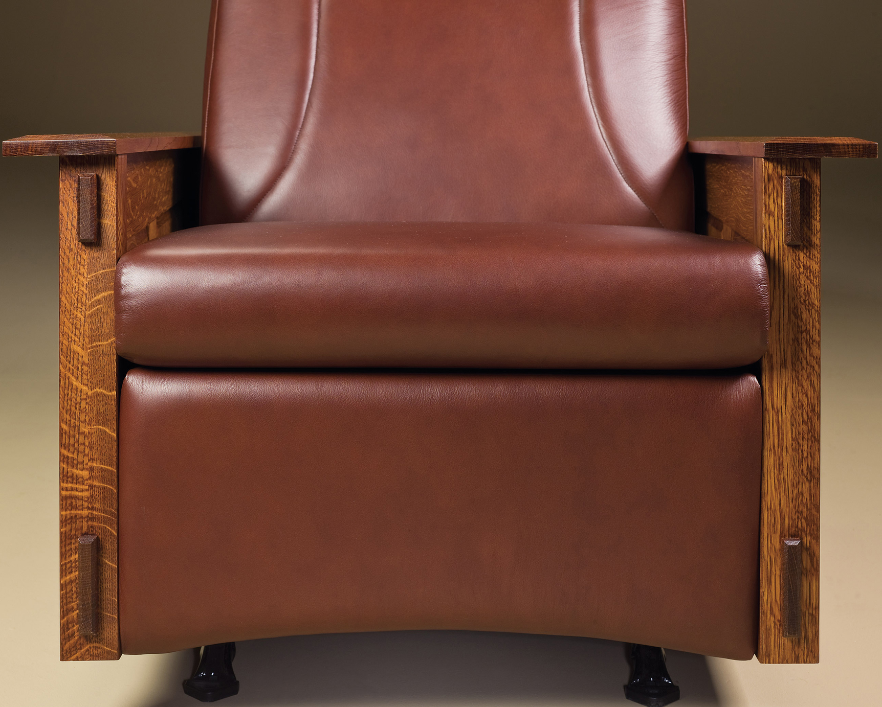 This Reclining Rocker is available as shown or unfinished. Or, we will custom-build yours to meet your needs and desires. So tell us your wishes. Like the wood species and finish. Also, you may choose from several genuine full-hide leather or faux leather options. Or from hundreds of available fabrics.
